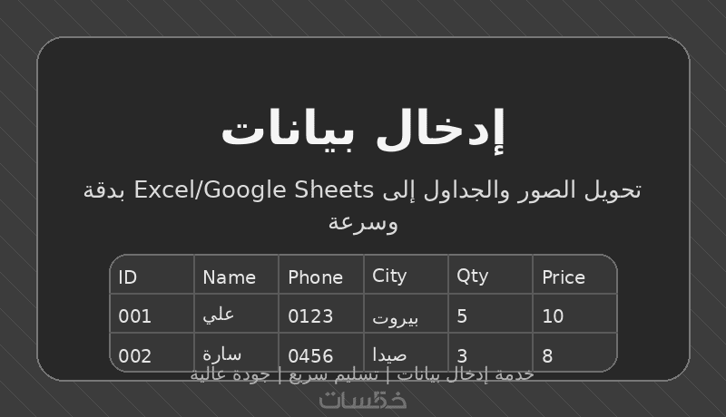 أقدّم خدمة إدخال بيانات من صور أو جداول إلى ملف Excel أو Google Sheets بدقة عالية وبشكل مرتب.