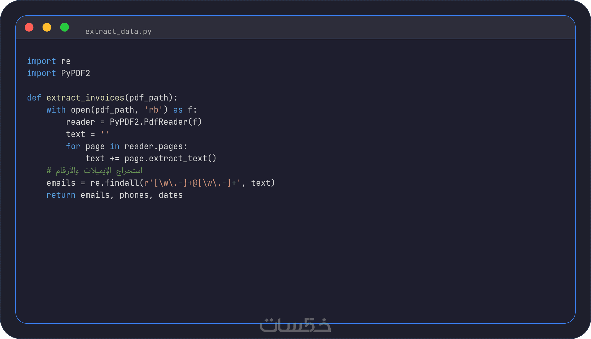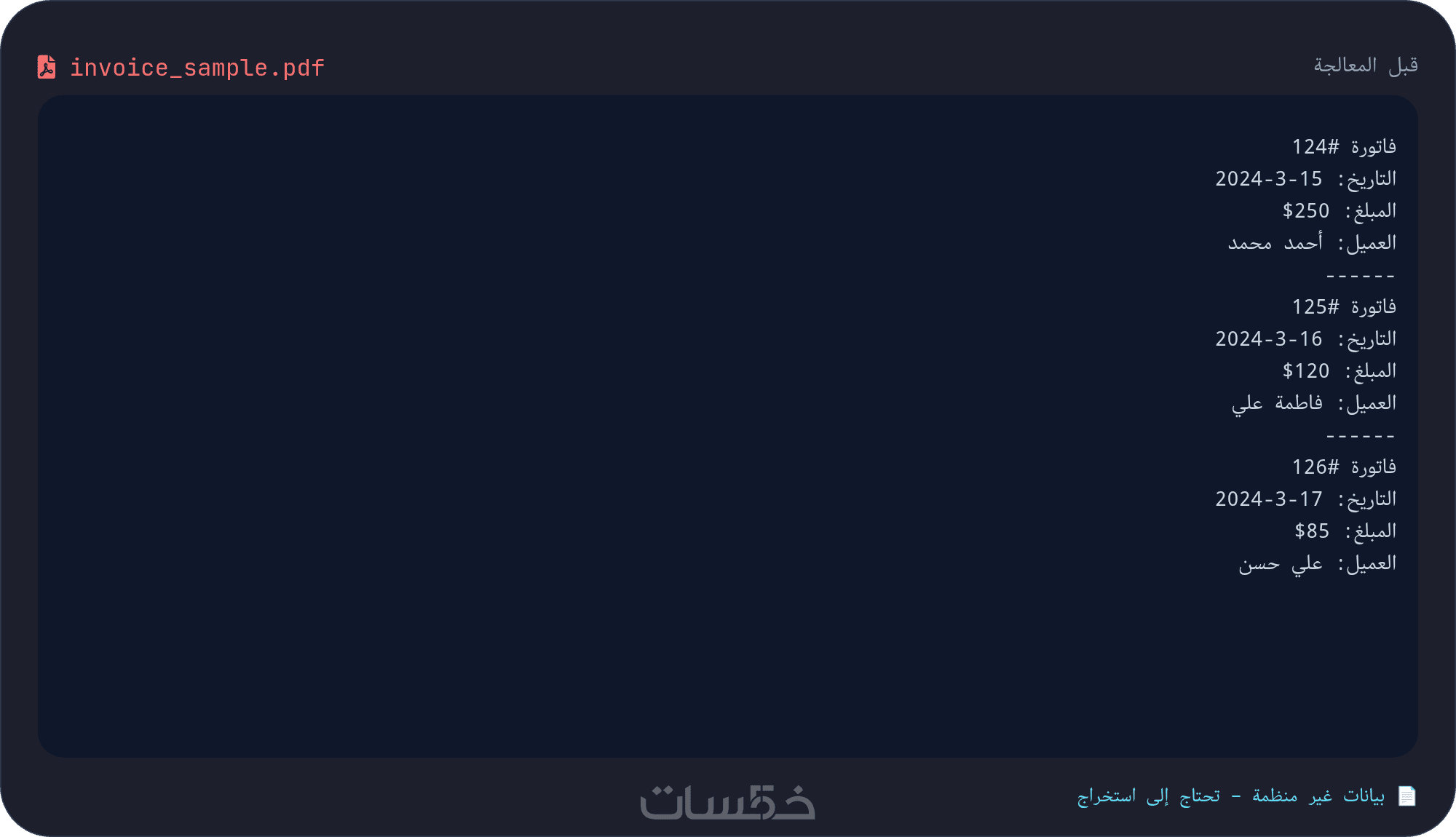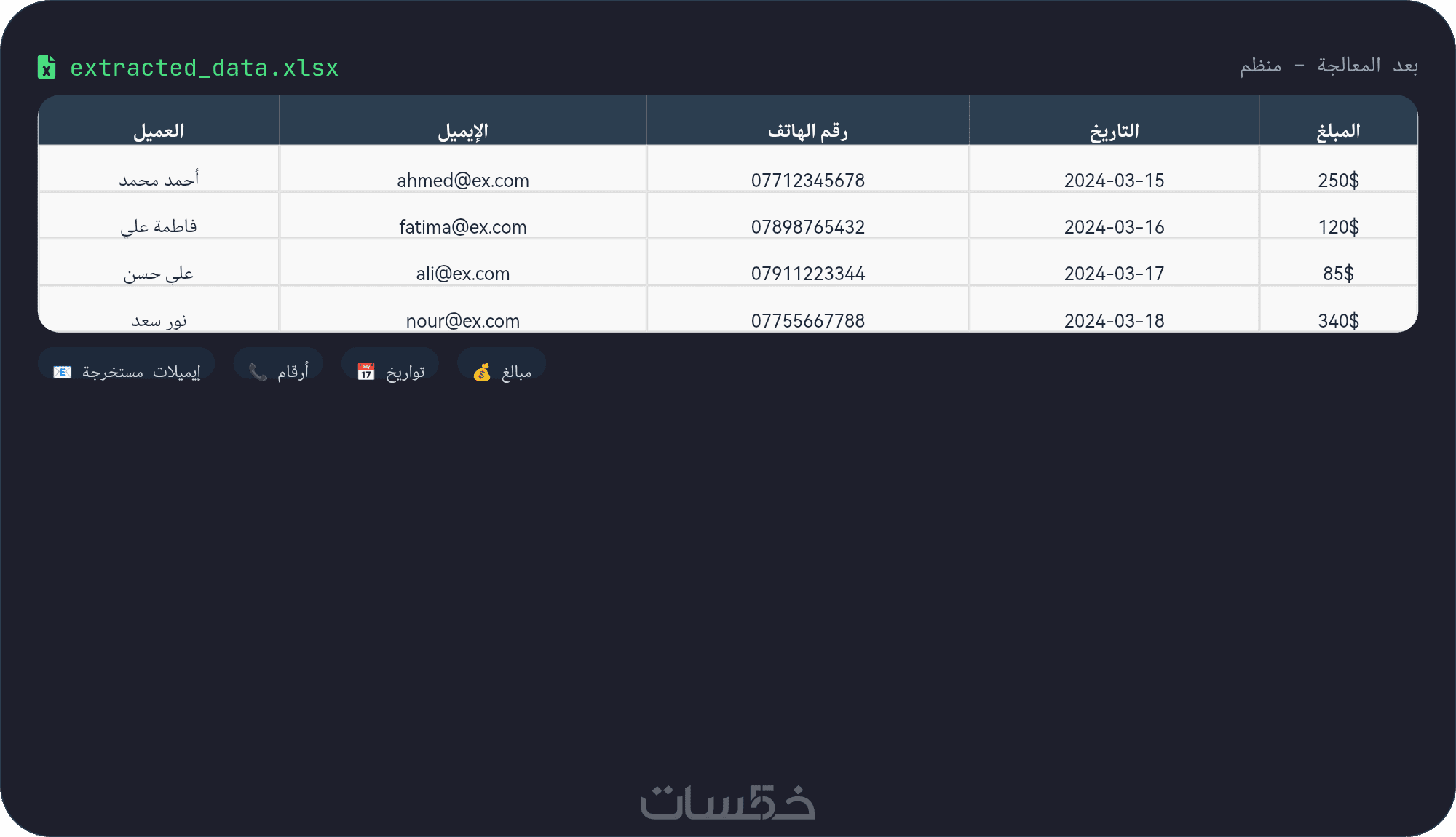 · البيانات المستخرجة مرتبة في جداول واضحة (نصوص، أرقام، تواريخ، إيميلات، هواتف، مبالغ مالية).
