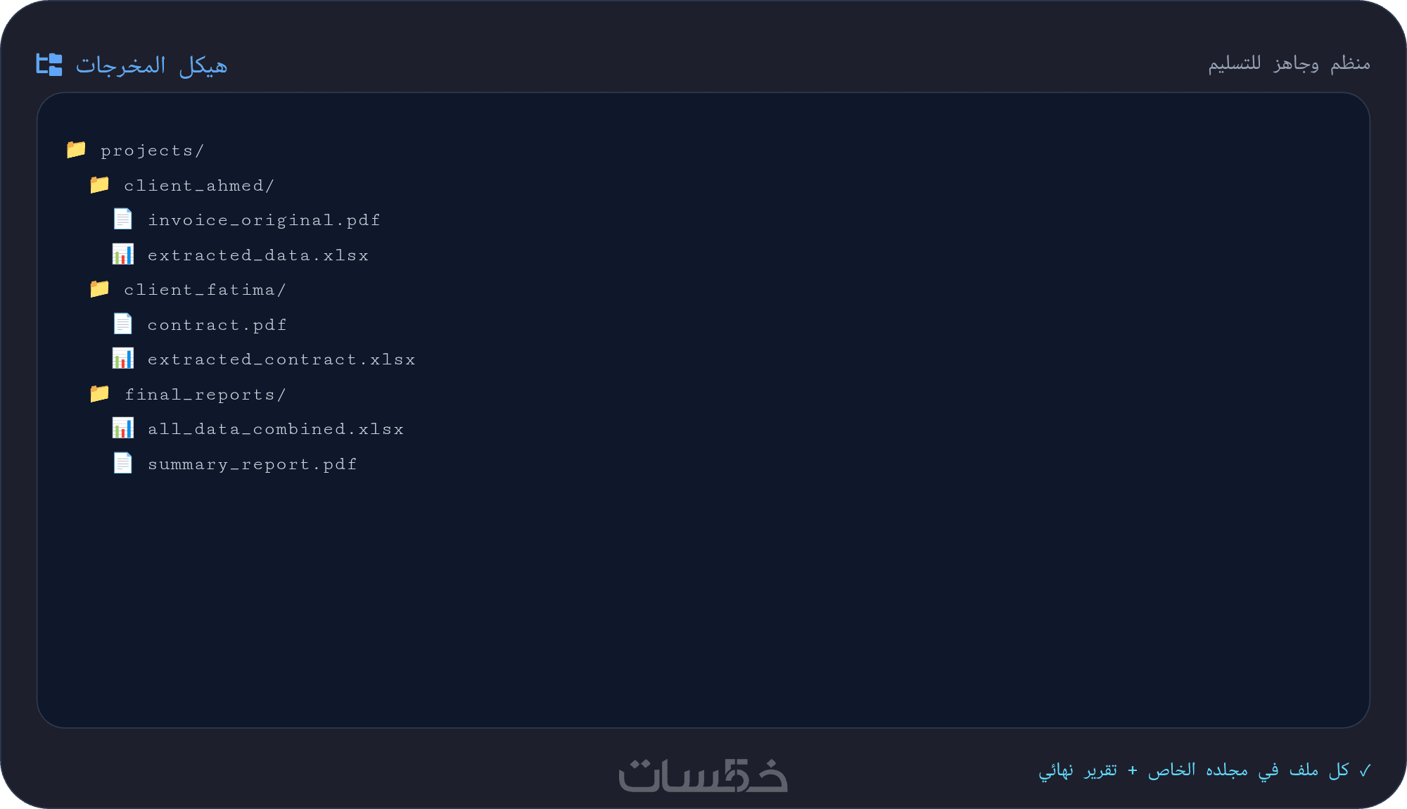 · تقرير بسيط يوضح عدد الصفحات أو الملفات التي تمت معالجتها ونوع البيانات المستخرجة (يُقدم عند الحاجة).