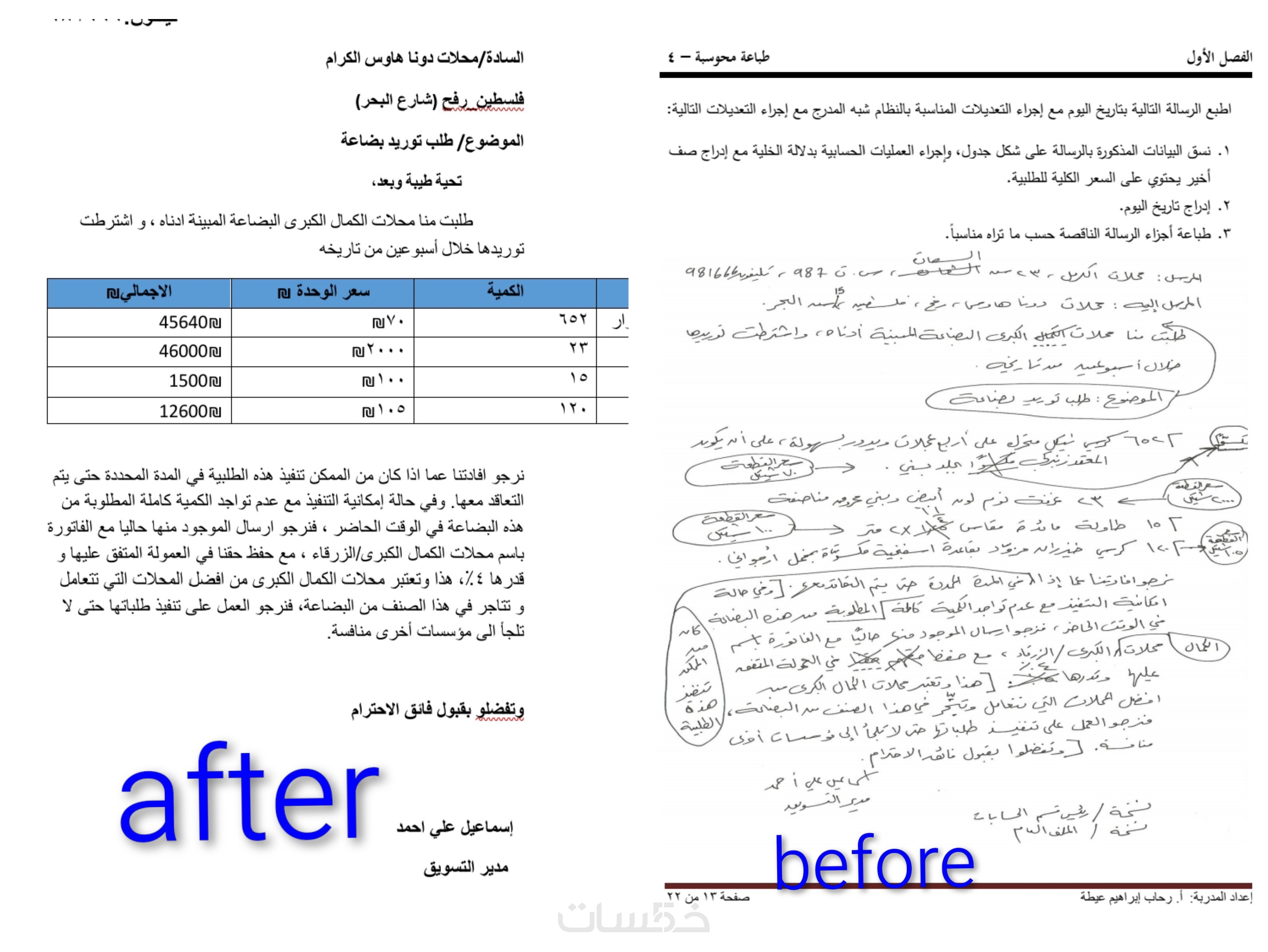 مطابقة 100%: نسخة رقمية طبق الأصل عن المسودة اليدوية أو الملف الأصلي مع مراعاة كافة التعديلات المطلوبة.