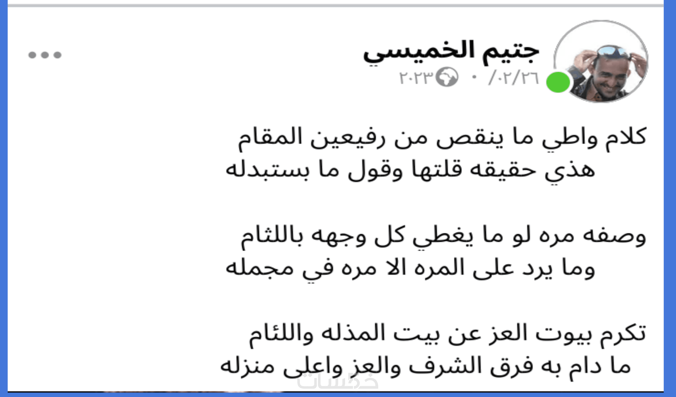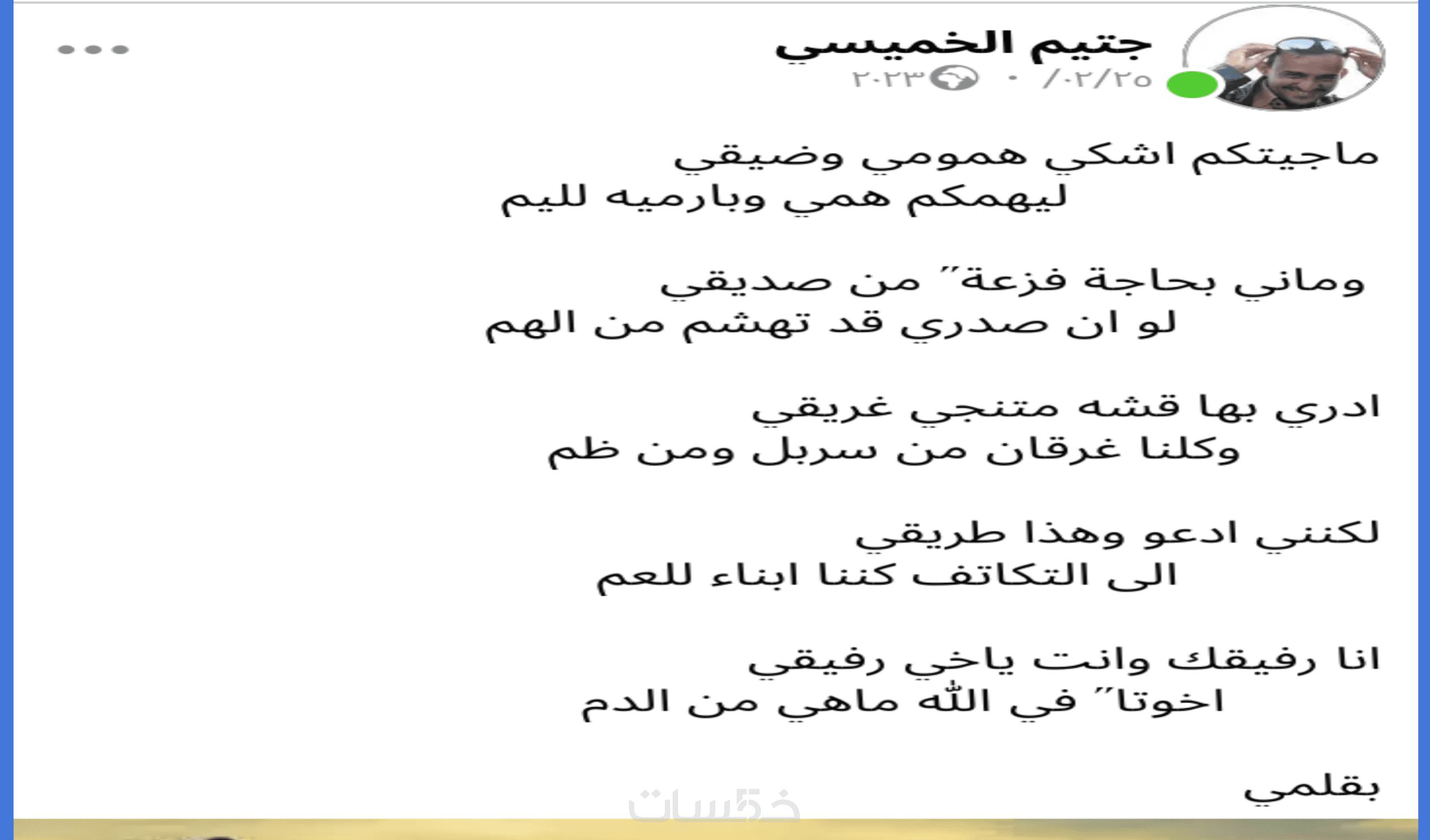 مرحبا واهلا وسهلا فيك. معاك اخوك الشاعر جتيم الخميسي شاعر اكتب الشعر النبطي والعامي باحترافيه. متمكن من الوزن الشعري والحمدلله عالم بعلم العروض وكذلك وزن الابيات الشعريه وضبطها باللحن والرتم الصوتي