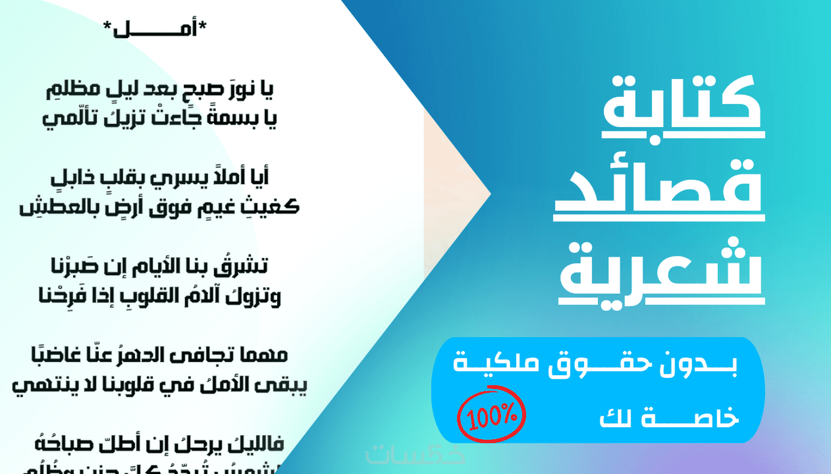 "أقدّم خدمة كتابة قصائد شعرية مُخصصة بأسلوب راقٍ ومميز يُلبي احتياجاتك ويُعبر عن مشاعرك. سواء كنت تبحث عن قصيدة رومنسية تهديها لشخص مميز، أو قصيدة تعبّر عن مناسبتك الخاصة، أو حتى أبيات شعرية تحمل طابعاً أدبياً فريداً، ستجد ما يُدهشك. يتم كتابة القصيدة بعناية تامة، مع اختيار الكلمات والوزن والقافية بما يتناسب مع رؤيتك وأهدافك. أعدك بعمل فني يُخلّد ذكرياتك ويترك أثراً عميقاً في القلوب."