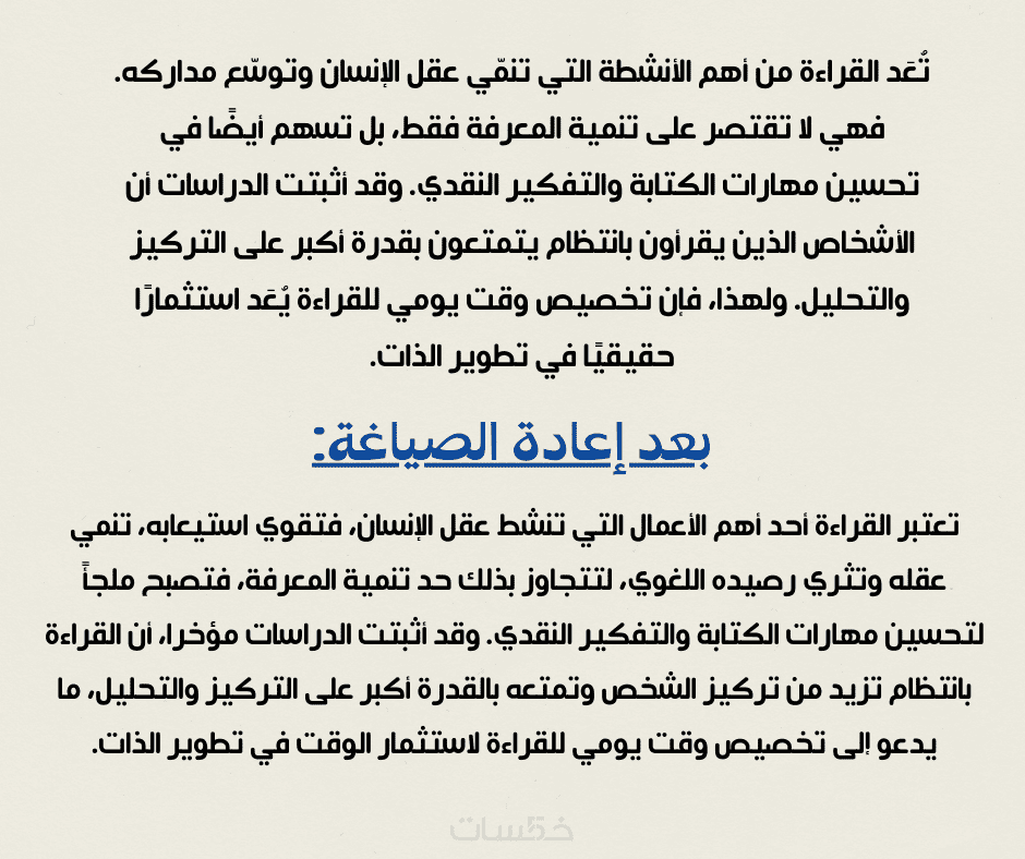 أضمن لك مراجعة دقيقة للنص وتصحيح جميع الأخطاء الإملائية والنحوية، وضبط علامات الترقيم بما يتناسب مع السياق.