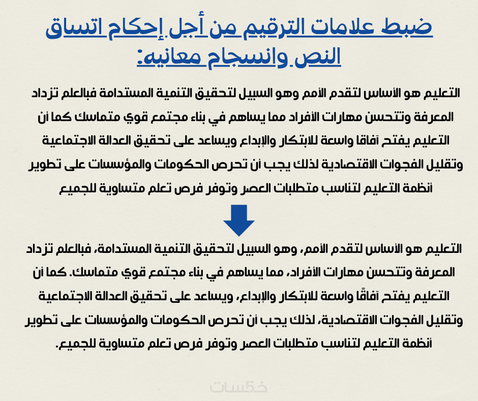 ضبط علامات الترقيم (الفاصلة، النقطة، النقطتان، الشرطتان... إلخ) بما يتناسب مع المعنى والسياق اللغوي.