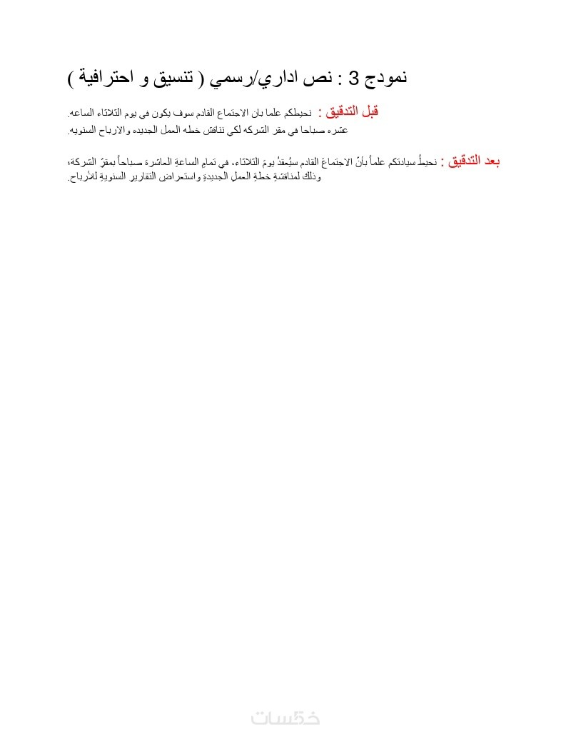تسليم العمل في ملف Word بنسختين: (نسخة بها التعديلات الموضحة، ونسخة نهائية جاهزة).