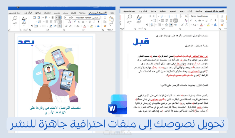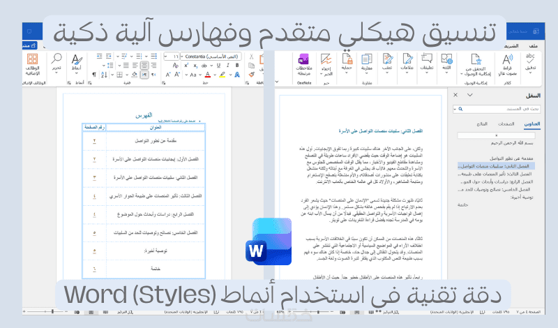تنسيق Word متقدم: ضبط الهوامش، المسافات، واستخدام الأنماط (Styles) لتوحيد هيكل الملف.