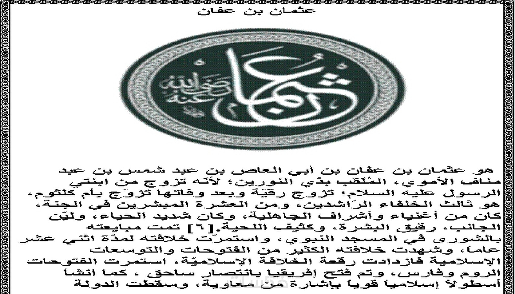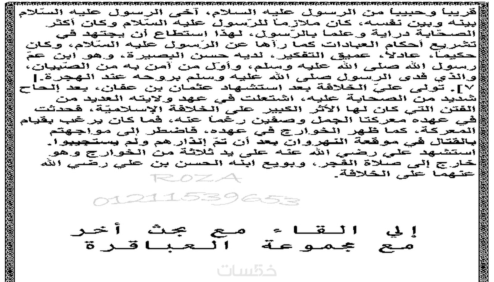 بحث بسيط عن الخلفاء الراشدين من مصادر موثوق بها حجم ورقA4 أبيض وأسود للبحوث المدرسية ويوجد خدمة التعديل عليه وممكن تستخدمه في اشياء ثانية كثير بتمني من ربنا انه يعجبكم ويعجب الموقع ولا تنسوا الطباعه A4ابيض واسود عدد الورق(10ورقات)