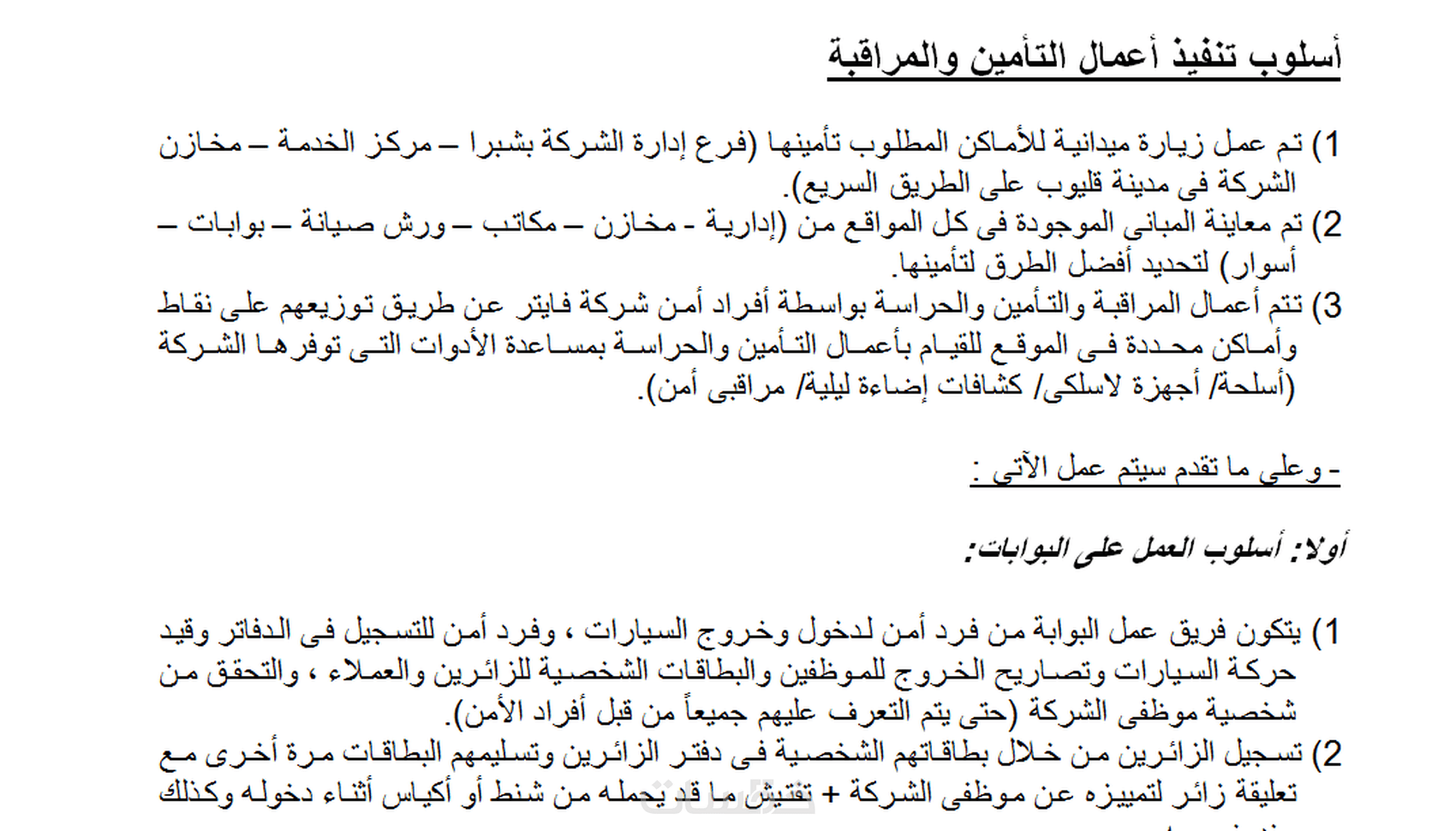8- يتم الإتفاق على المقابل المادى بعد وضع التصور المبدئى للدراسة الأمنية لتأمين الموقع وقبل وضع الخطة الأمنية.