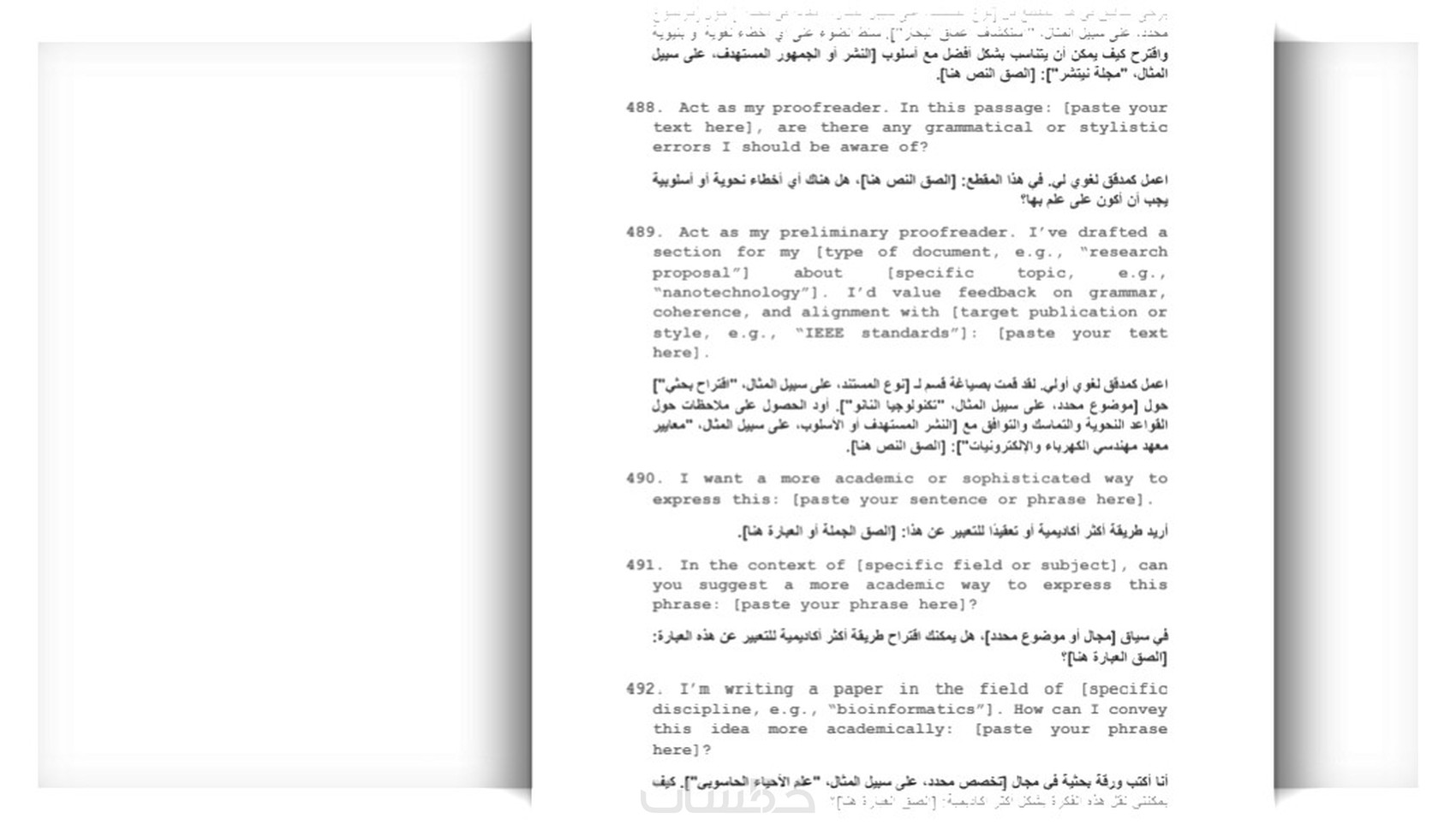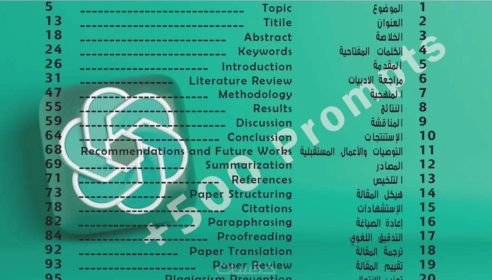 **عندما تطلب الخدمة سنرسل لك ملف بصيغة PDF مكون من 95 صفحة تحتوي على ازيد من +500 امر (+500 Prompts) التي تحيط بجميع مراحل الكتابة الاكاديمية بحيث ستساعدك كثيرا في كتابة وانشاء بحثك العلمي والاكاديمي بداية من منهجية البحث ,تصميم البحث,مقدمة البحث تحليل موضوع البحث حتى الخاتمة .