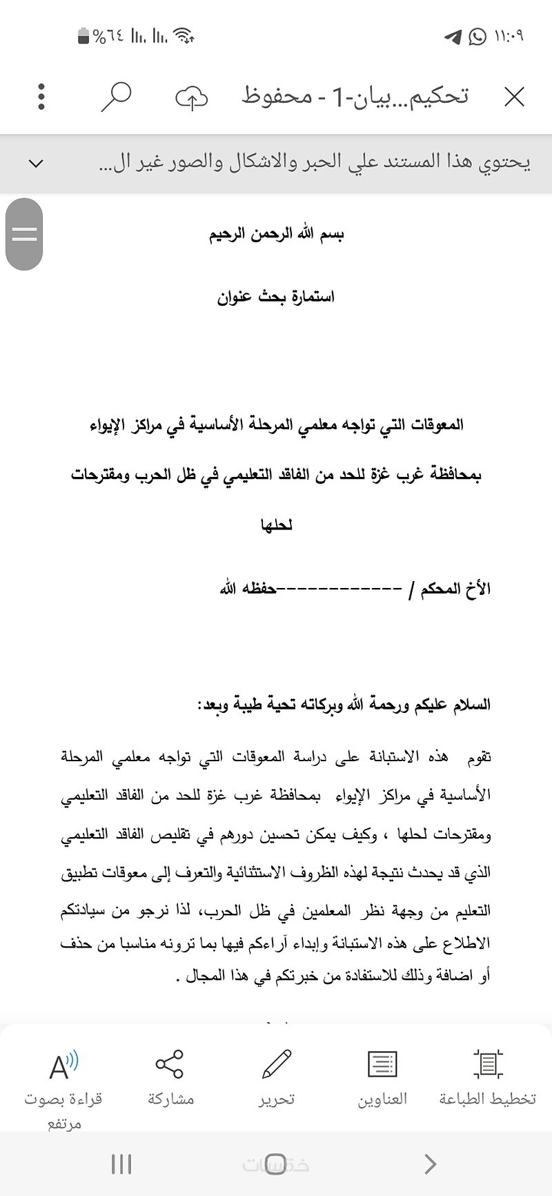 استبيان عن كيفية الحد من الفاقد التعليمي في غزة