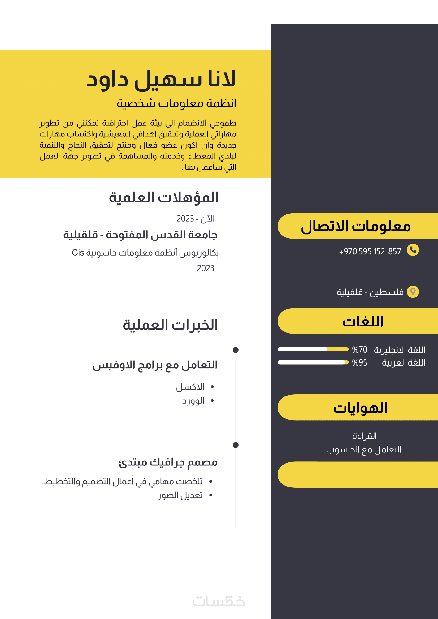 يمكنك من خلال هذه الخدمة امتلاك سيرتك الذاتية بتصميم فريد ومميز مختلف عن الاشكال الاعتيادية بدقة في الكتابة والالوان .