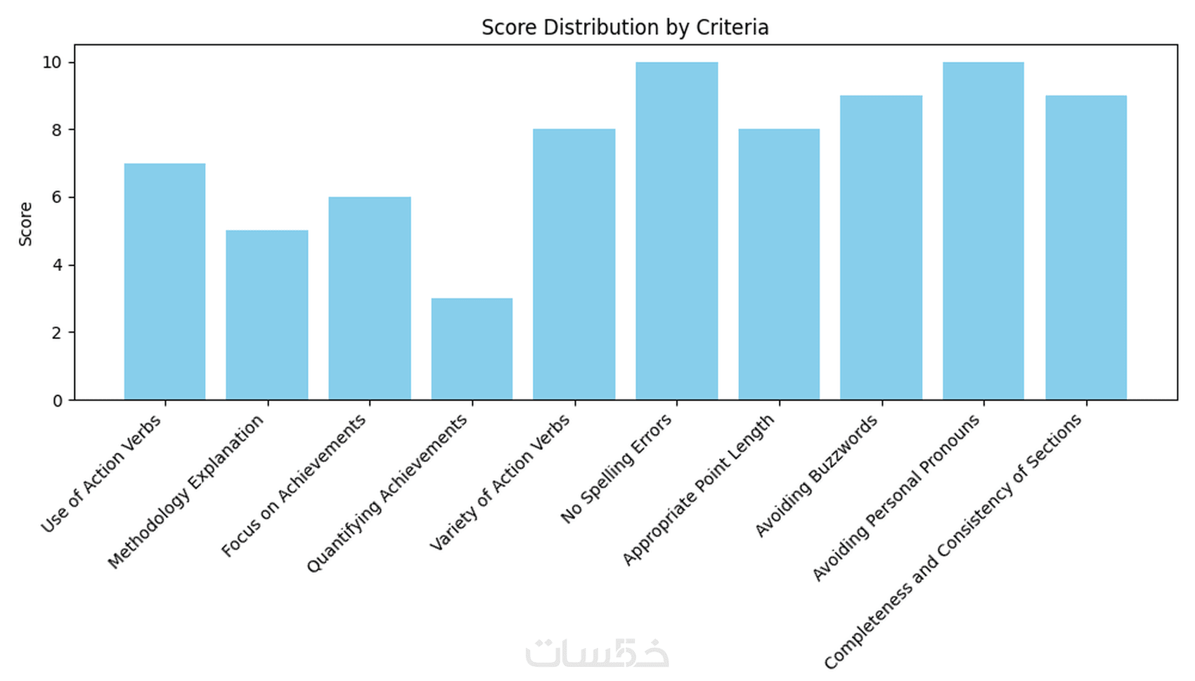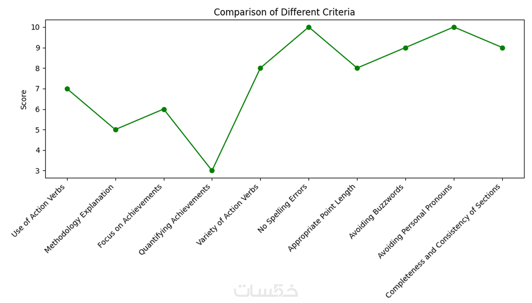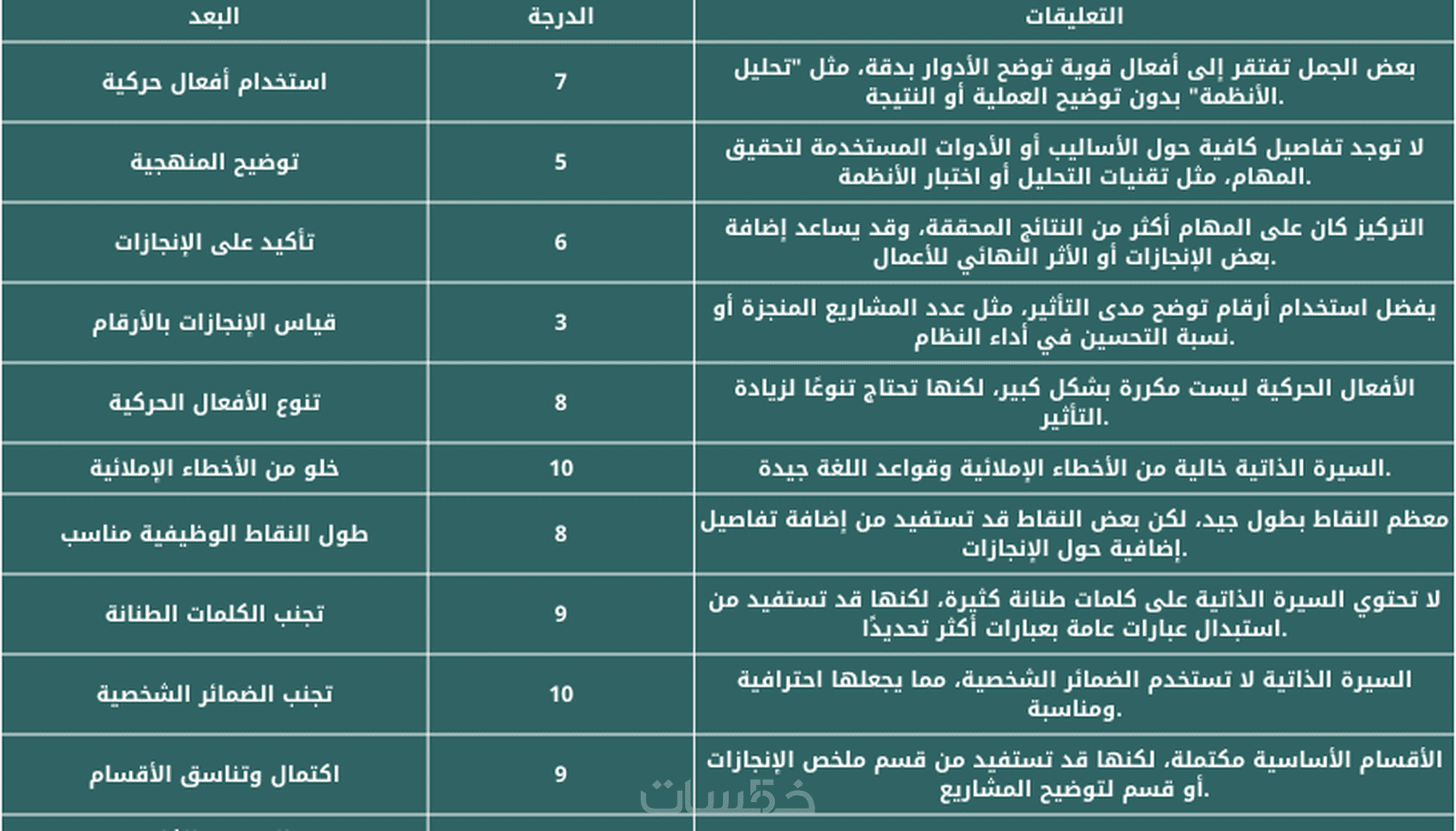 تقييم شامل للسيرة الذاتية: نفحص سيرتك الذاتية بناءً على مجموعة من الأبعاد مثل استخدام الأفعال الحيوية، التركيز على الإنجازات، وتوضيح المنهجية المتبعة في تحقيق النتائج.
