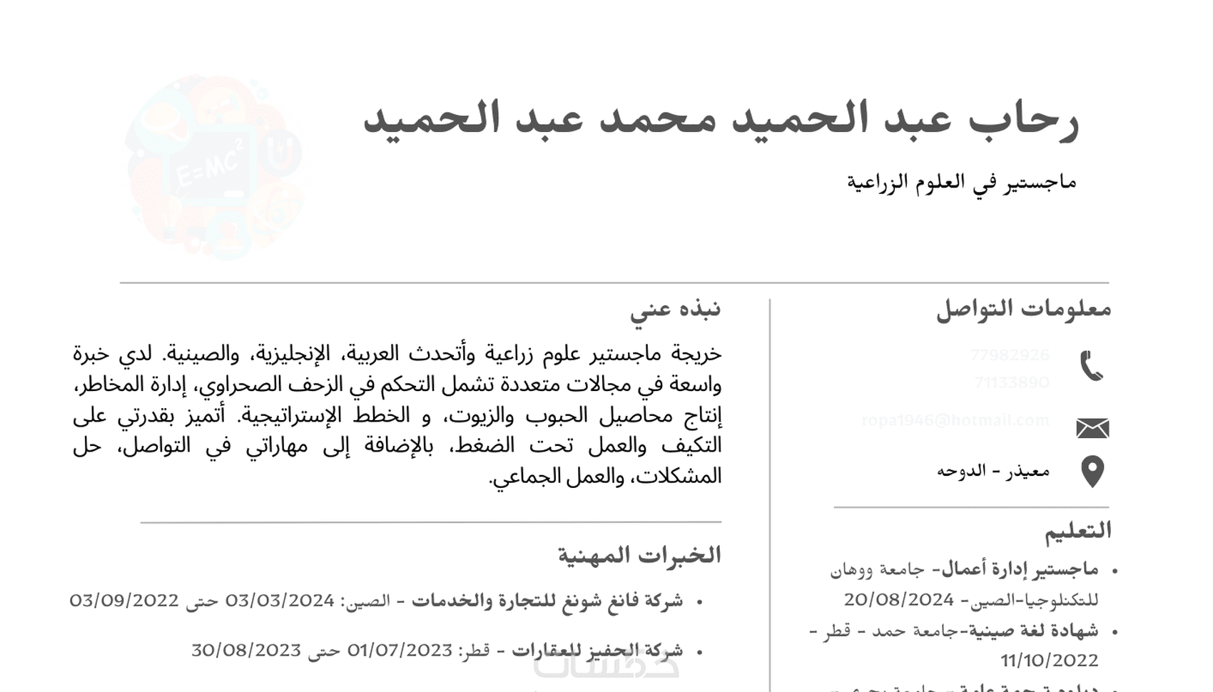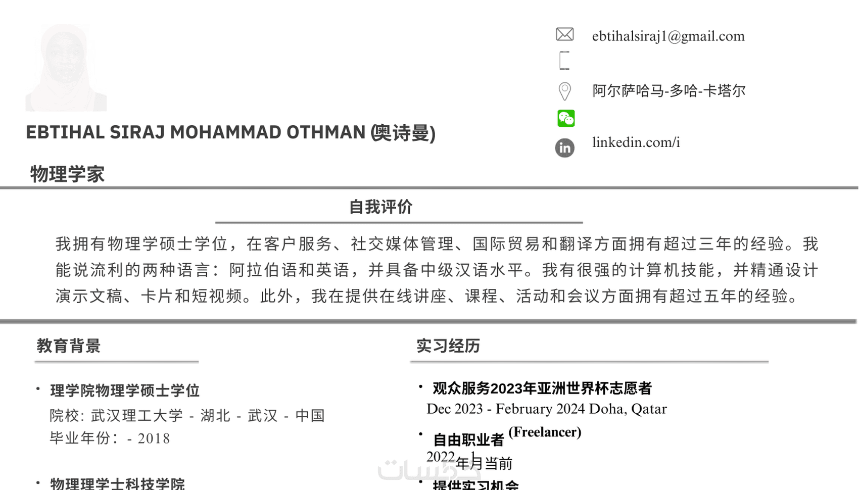 سيرة ذاتية مكتوبة بشكل احترافي باللغة العربية أو الإنجليزية أوالصينية.