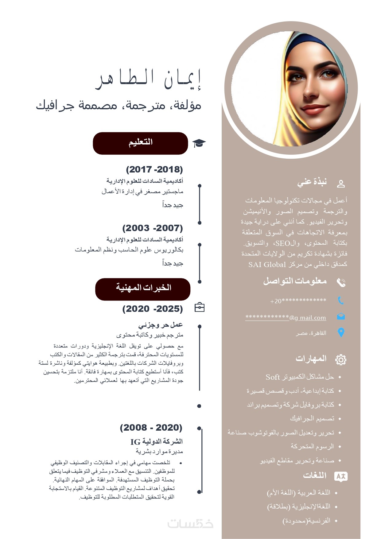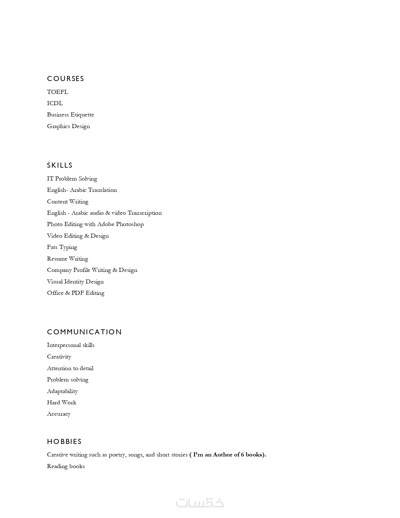 مقابل مبلغ الخدمة: إعداد سيرة ذاتية احترافية عدد صفحتين، باللغة العربية أو الإنجليزية، ومتاح التعديل مرتين مجاناً.