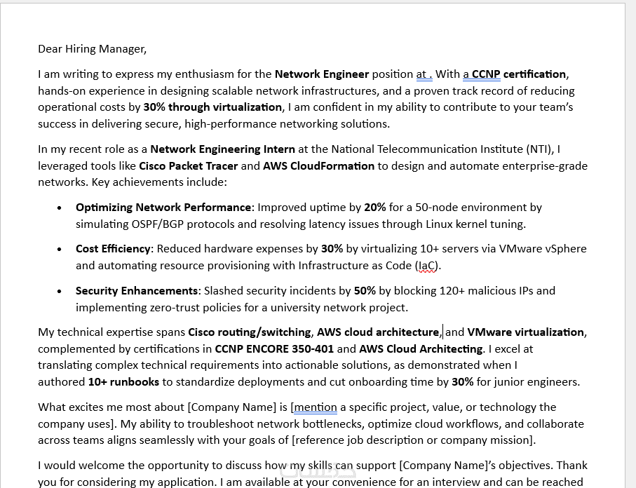 خطاب تغطية احترافي مخصص للوظيفة المستهدفة، يبرز أهم مهاراتك وإنجازاتك ويشرح سبب كونك المرشح المثالي للوظيفة. ستحصل عليه بصيغتي PDF و Word.
