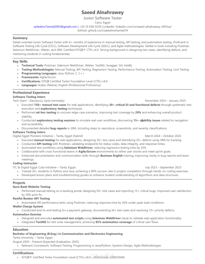 أقدم لك خدمة احترافية في إعداد السيرة الذاتية (CV) المتوافقة مع أنظمة تتبع المتقدمين (ATS) مع كتابة خطاب تغطية (Cover Letter) مميز يزيد من فرصك في الحصول على وظيفة أحلامك. بخبرة في مساعدة أكثر من 20 عميل سابق، أضمن لك سيرة ذاتية تبرز مهاراتك وإنجازاتك بطريقة جذابة ومنظمة تجتاز الفلترة الأولية للتوظيف.