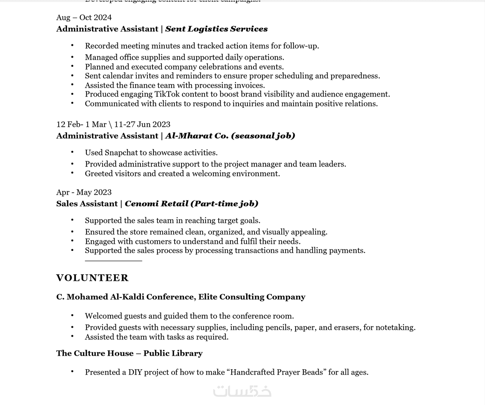 أقدّم خدمة كتابة وتنسيق السيرة الذاتية بشكل منظم وواضح، لتُبرز خبراتك ومهاراتك بالشكل الذي يليق بك.