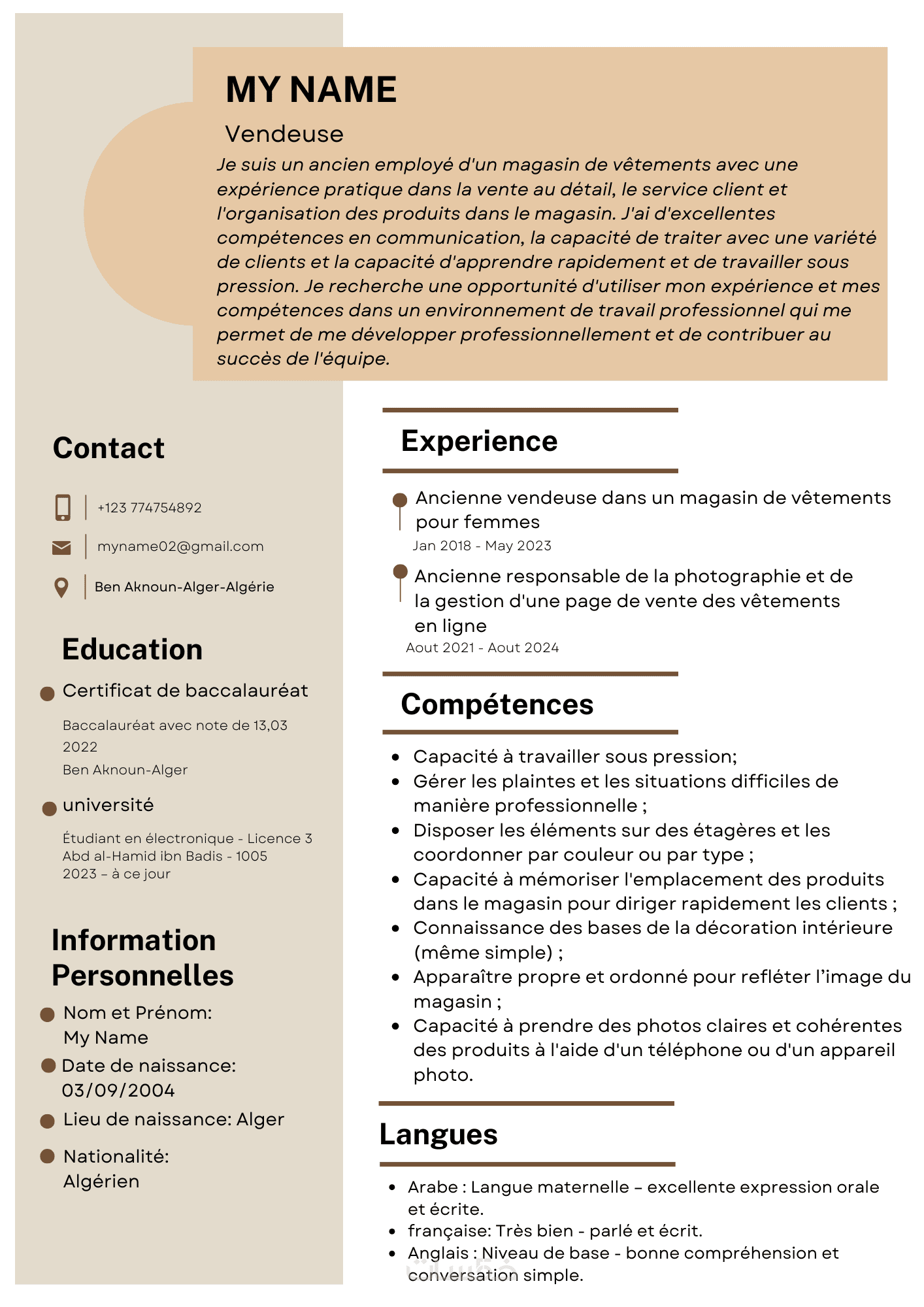 أقدم لك سيرة ذاتية (صفحة واحدة) احترافية بالعربية أو الإنجليزية أو الفرنسية، مصممة بشكل مميز لتبرز مهاراتك وخبراتك، بصياغة قوية وتنسيق واضح، مع إمكانية تعديل حتى الرضا التام.