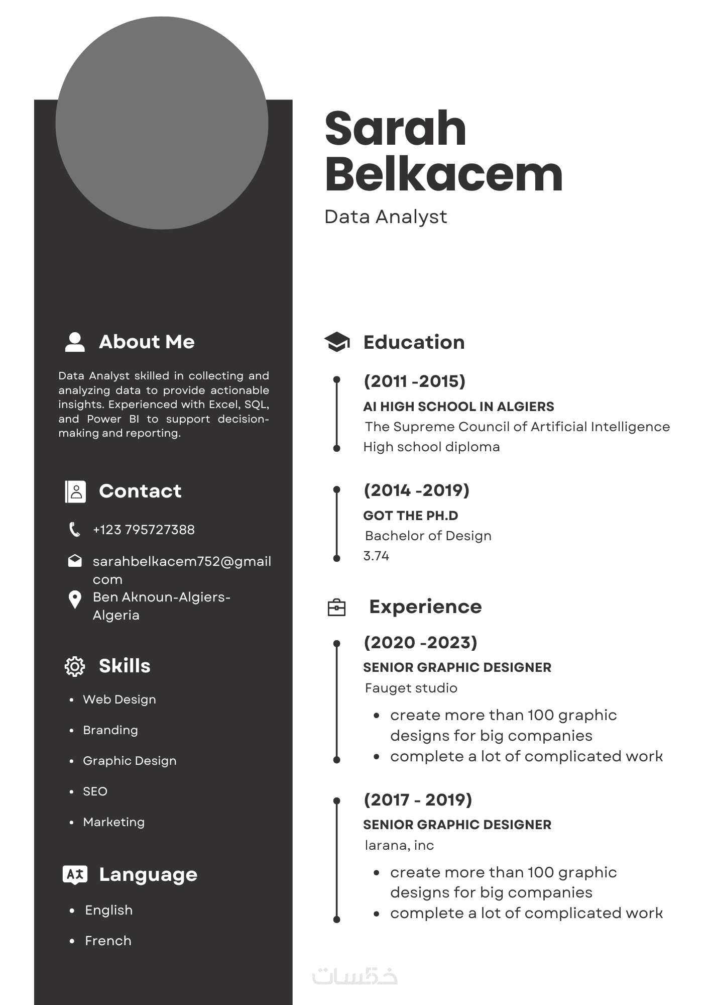 أكتب لك سيرة ذاتية منظمة ومصاغة بشكل احترافي باللغة التي تختارها، لتظهر بشكل مميز أمام أصحاب العمل.