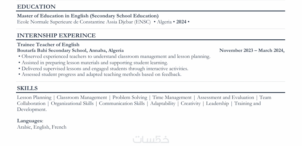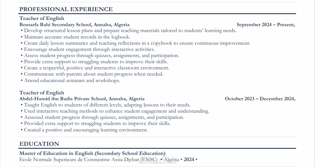 سأقوم بكتابة سيرة ذاتية احترافية من صفحة واحدة أو صفحتين باللغة العربية أو الإنجليزية أو الفرنسية . تشمل الخدمة تدقيقًا لغويًا وتصميمًا متوافق مع معايير تتبع المتقدمين ATS