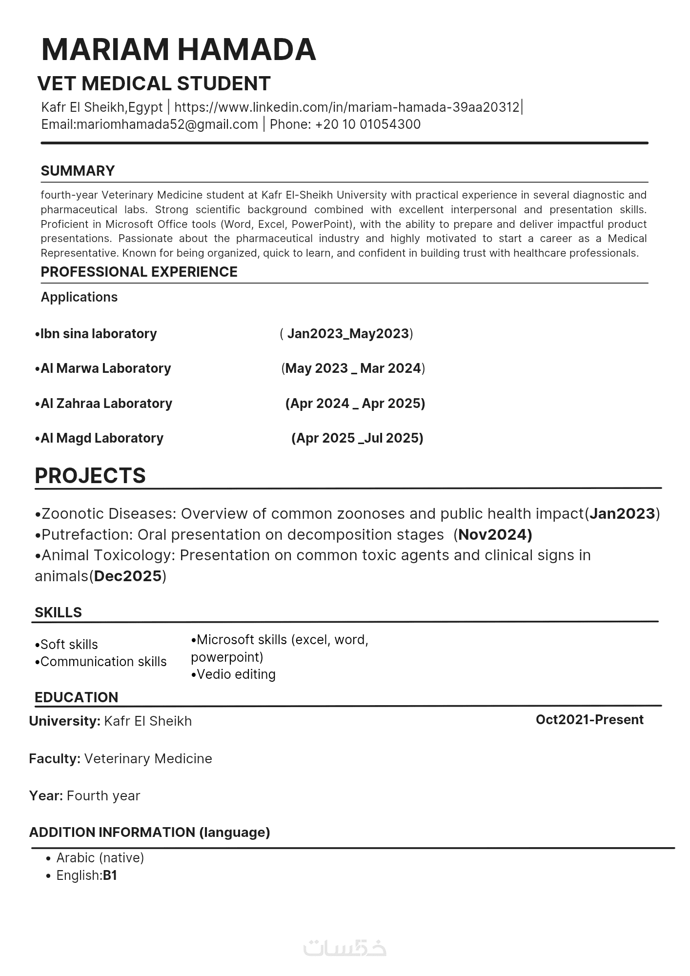 أعمل باستخدام أدوات مثل Microsoft Word وCanva لتقديم تصاميم أنيقة وسهلة القراءة، وأحرص دائمًا على كتابة محتوى مناسب لتخصصك ومجال عملك المستهدف.