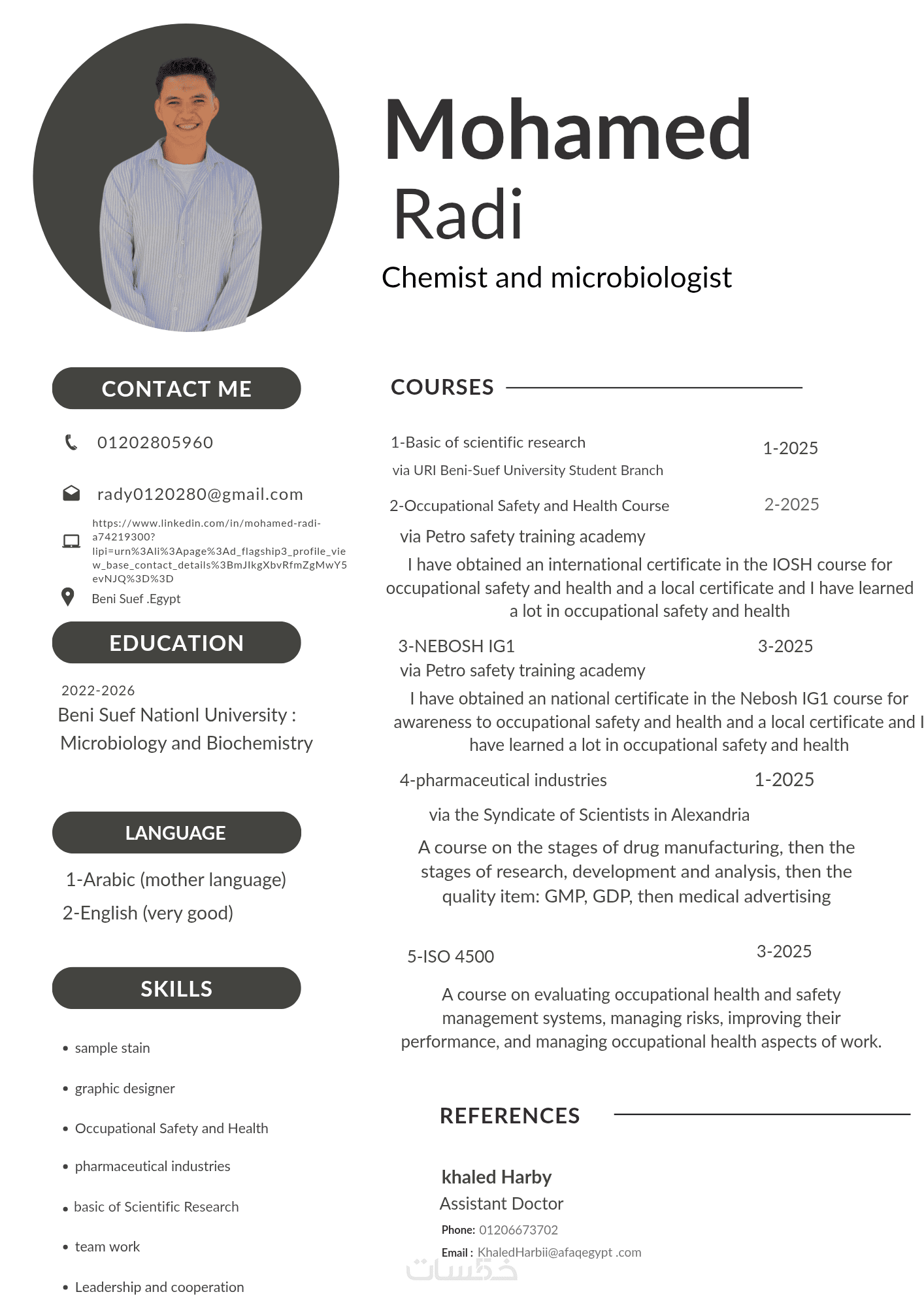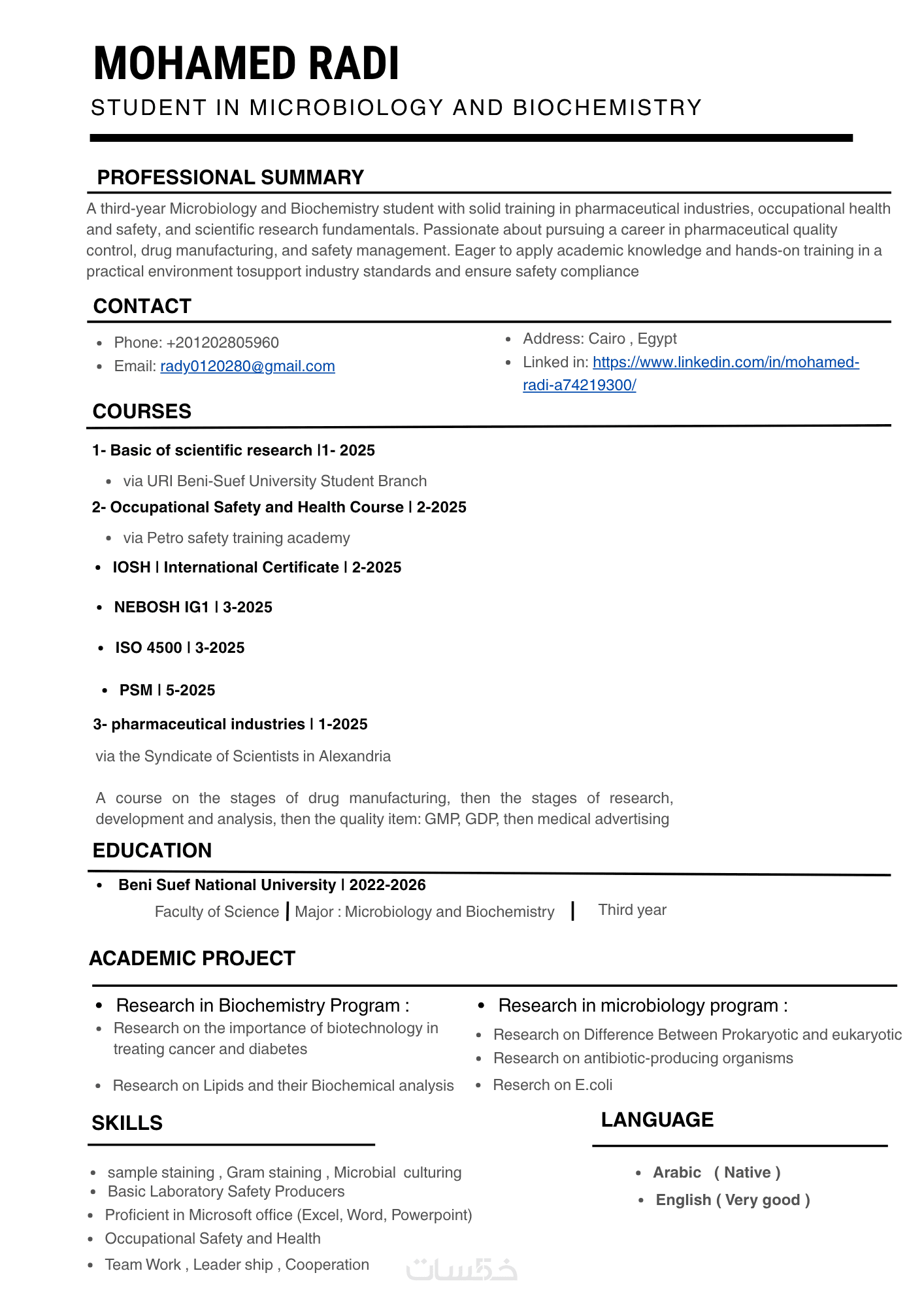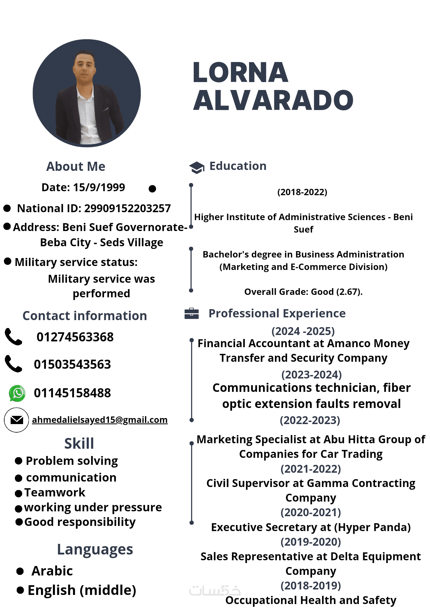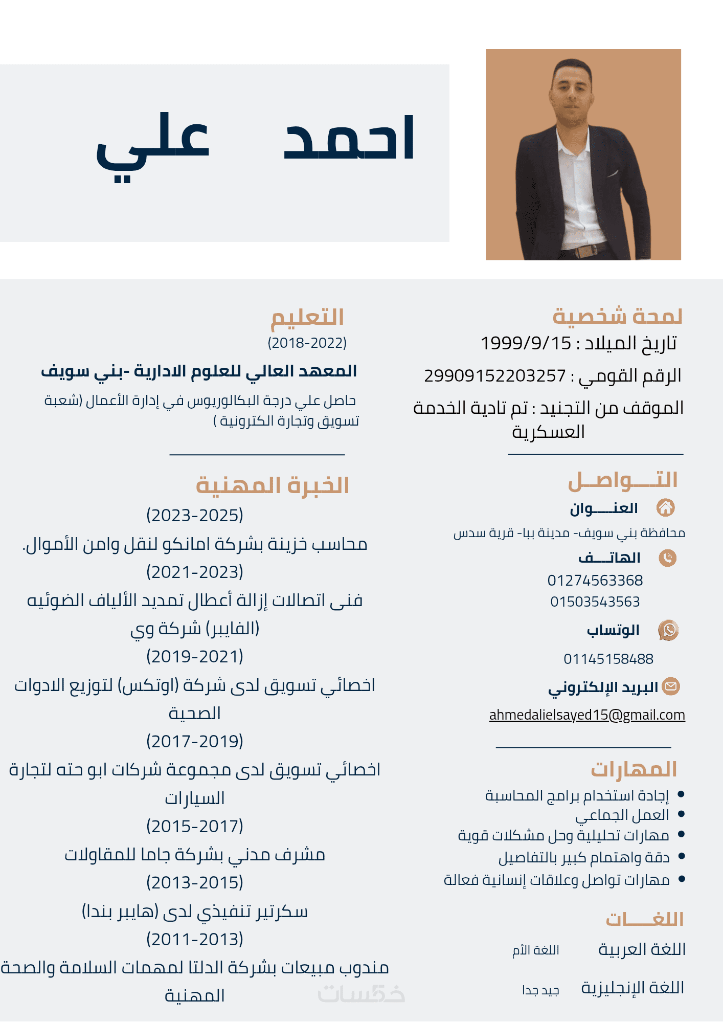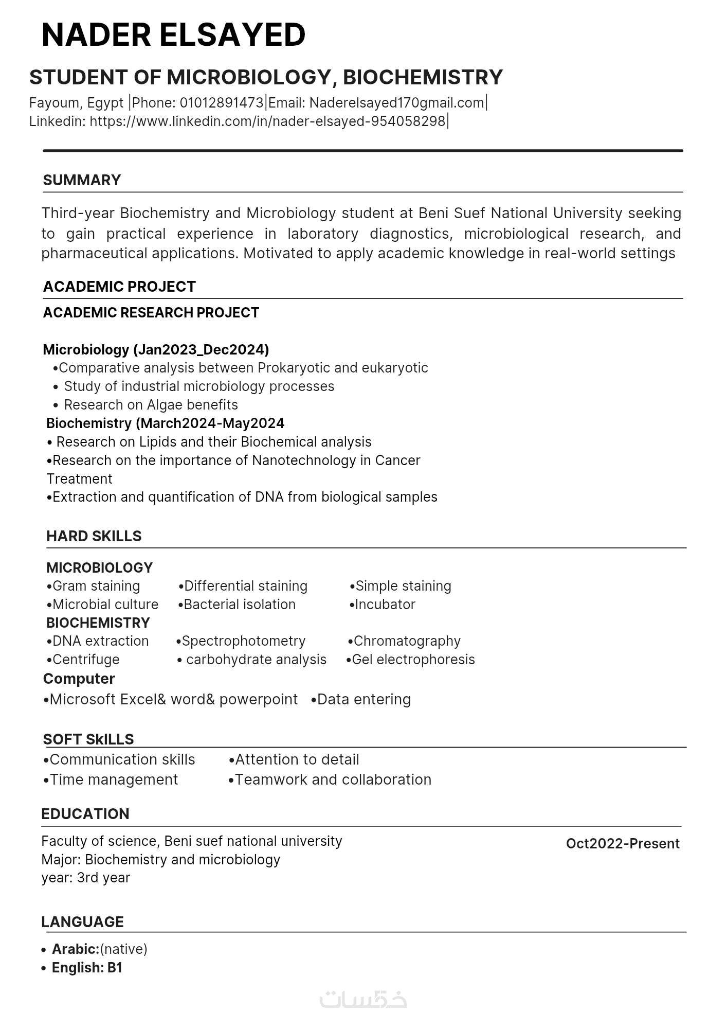 أنا نادر السيد، أقدم لك خدمة كتابة سيرة ذاتية احترافية تساعدك على لفت انتباه مسؤولي التوظيف واجتياز أنظمة تتبع المتقدمين (ATS) بنجاح.