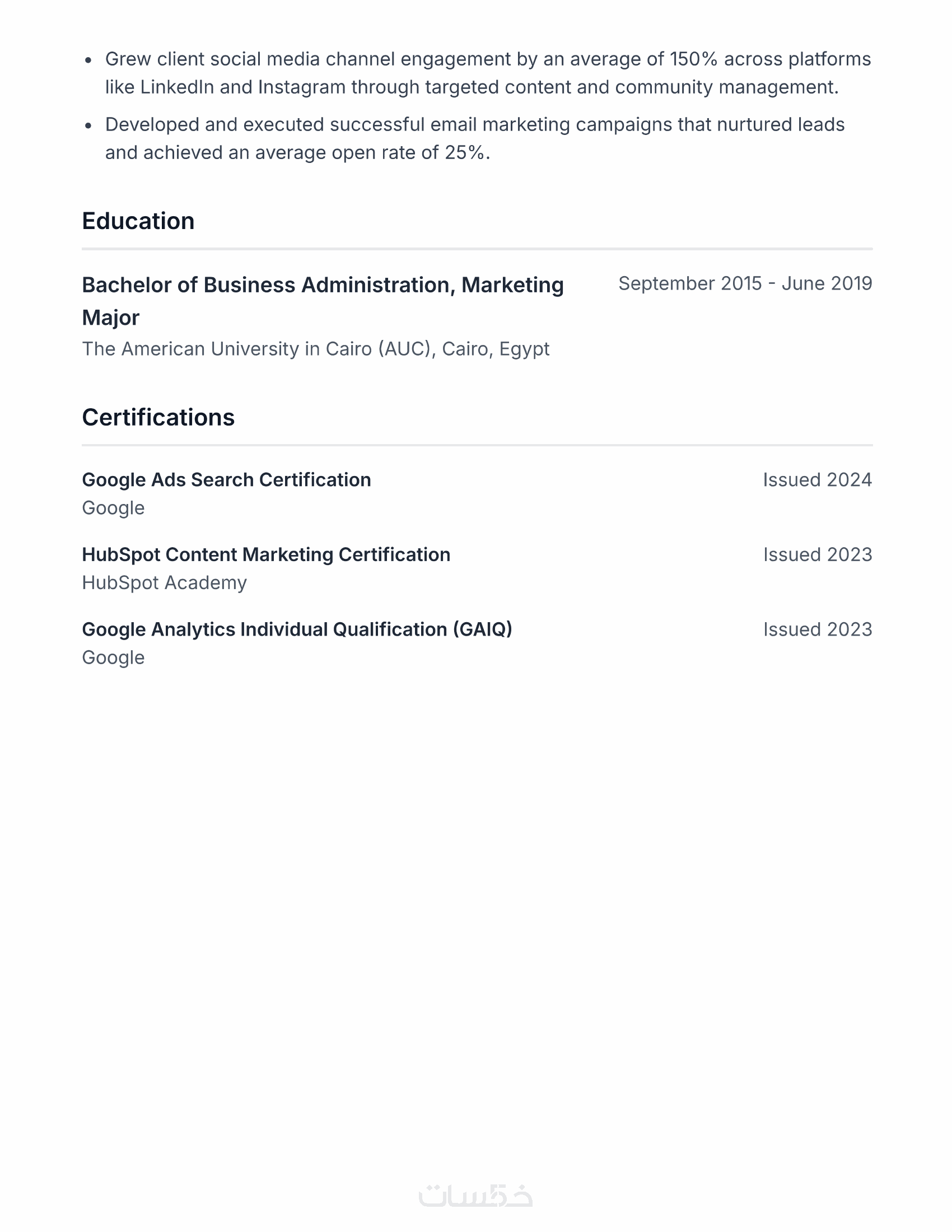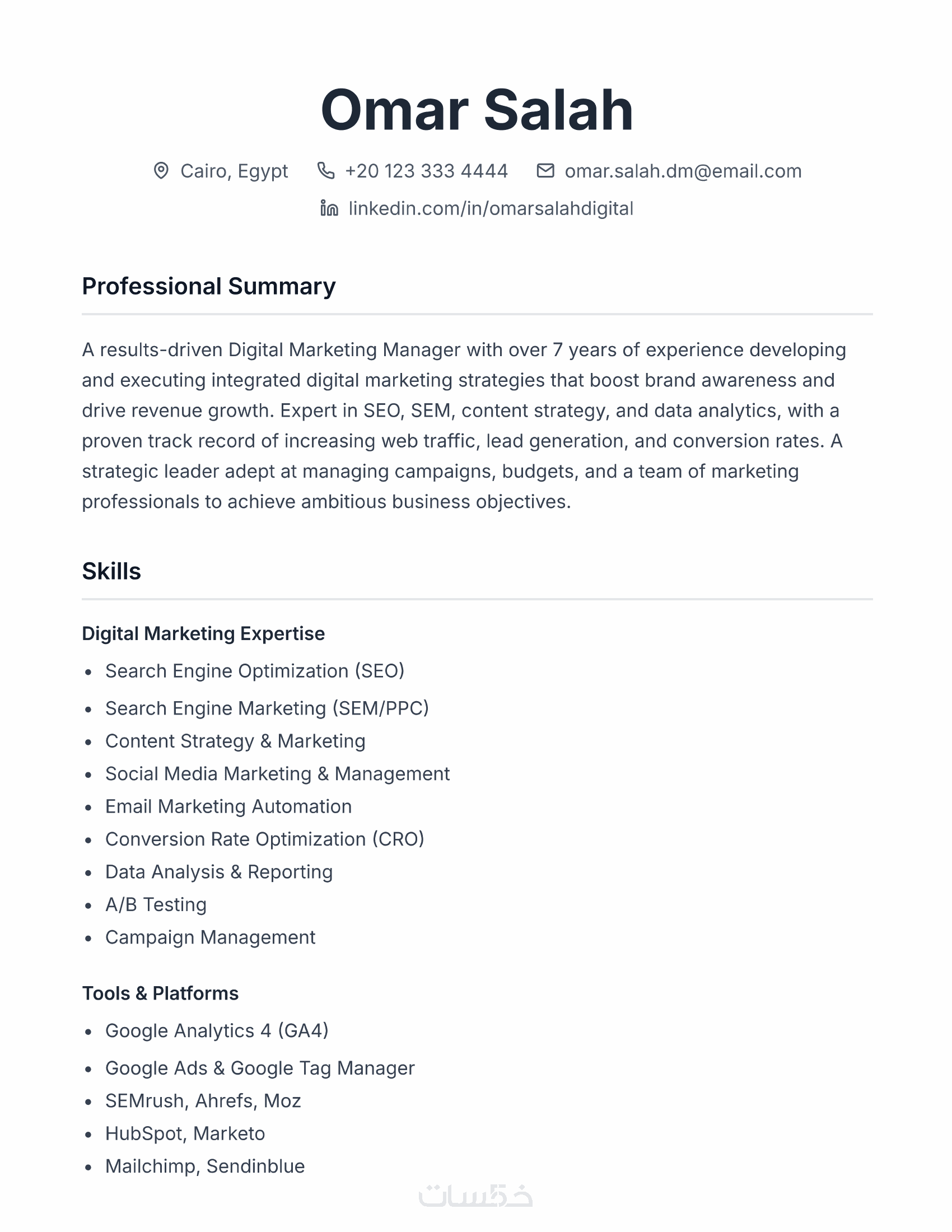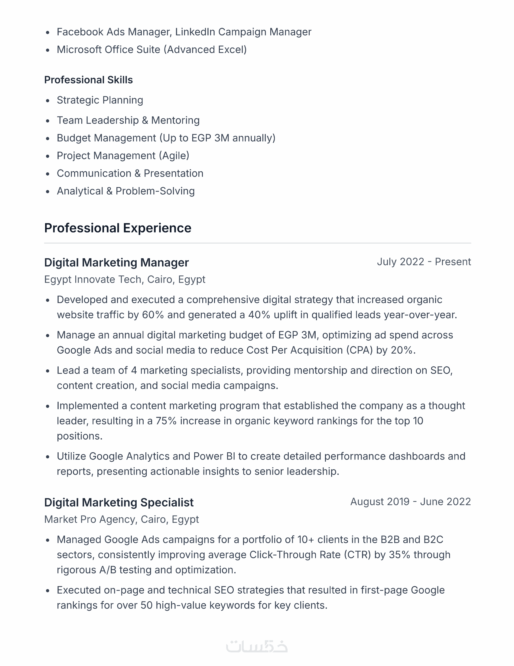 اختيار الكلمات المفتاحية والعبارات المؤثرة التي تعكس خبراتك ومهاراتك بأفضل شكل.