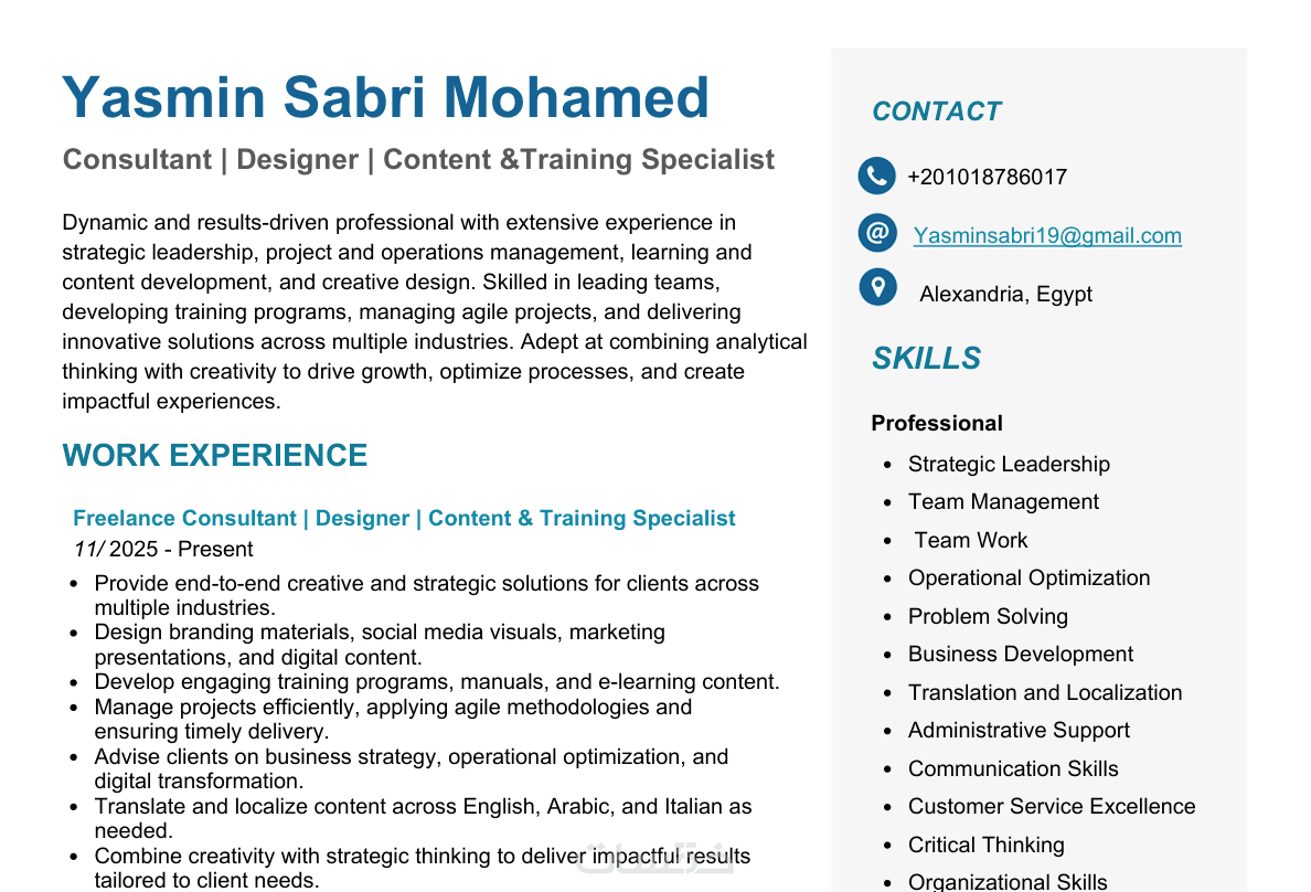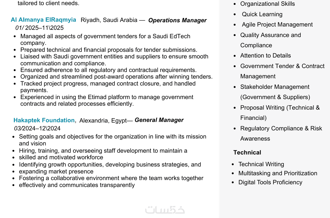 محتوى مُعدّ بعناية ومتوافق مع أنظمة ATS، مع تسليم السيرة بصيغتين Word وPDF وجاهزتين للتقديم الوظيفي.