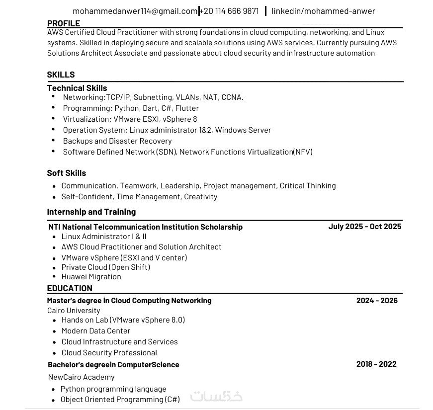 سأقوم بإنشاء سيرة ذاتية (CV / Resume) احترافية متوافقة مع أنظمة ATS، موجهة لوظائفك المستهدفة، وبأسلوب بسيط يسهل قراءته من قبل برامج الفرز ومديري التوظيف.