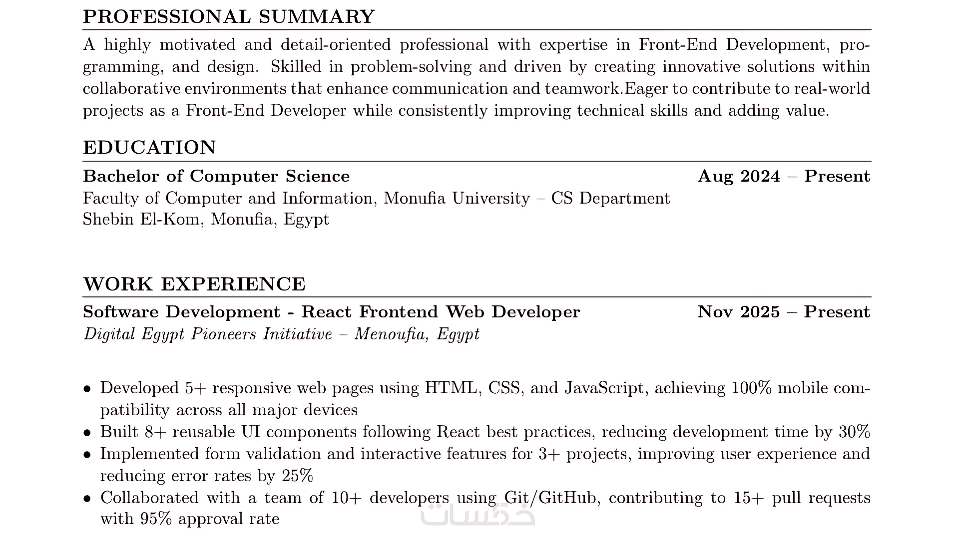 نسخة PDF مصممة بشكل احترافي، جاهزة للإرسال إلى أصحاب العمل أو الطباعة مباشرة.