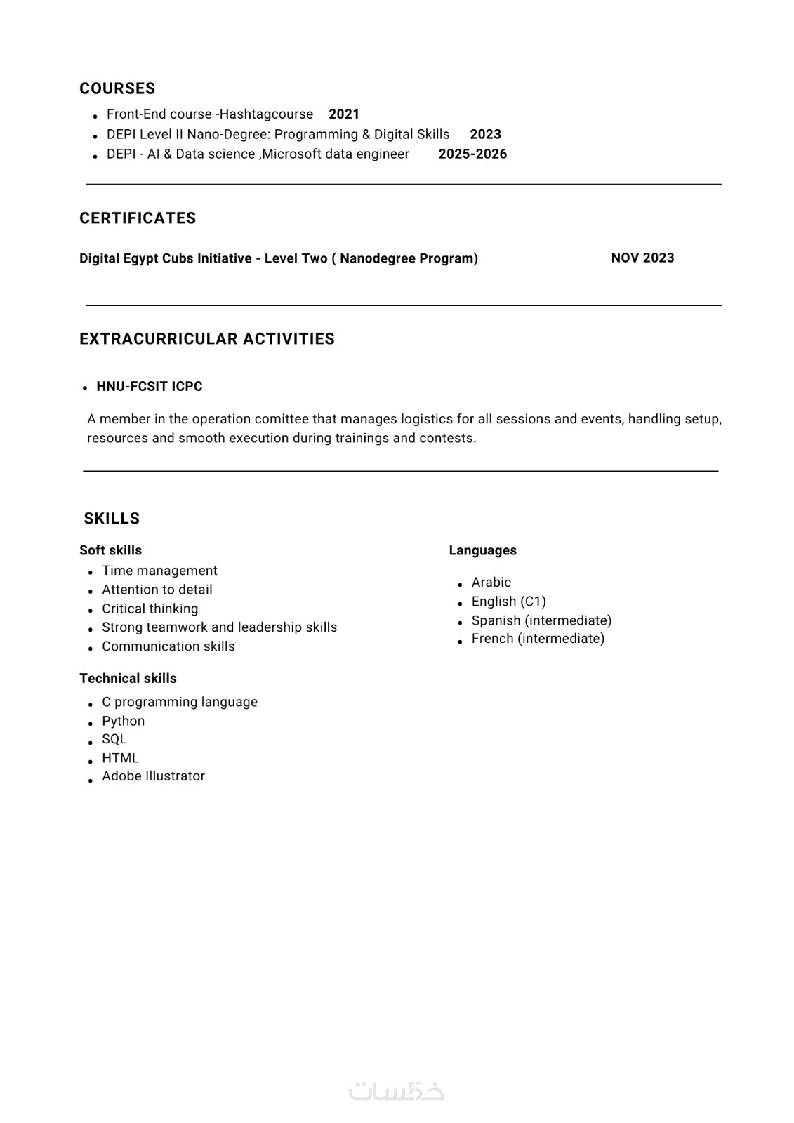 سأقوم بإنشاء سيرة ذاتية احترافية متوافقة مع أنظمة التوظيف (ATS) بالإضافة إلى تحسين حساب لينكدإن الخاص بك لزيادة فرص قبولك في الوظائف.