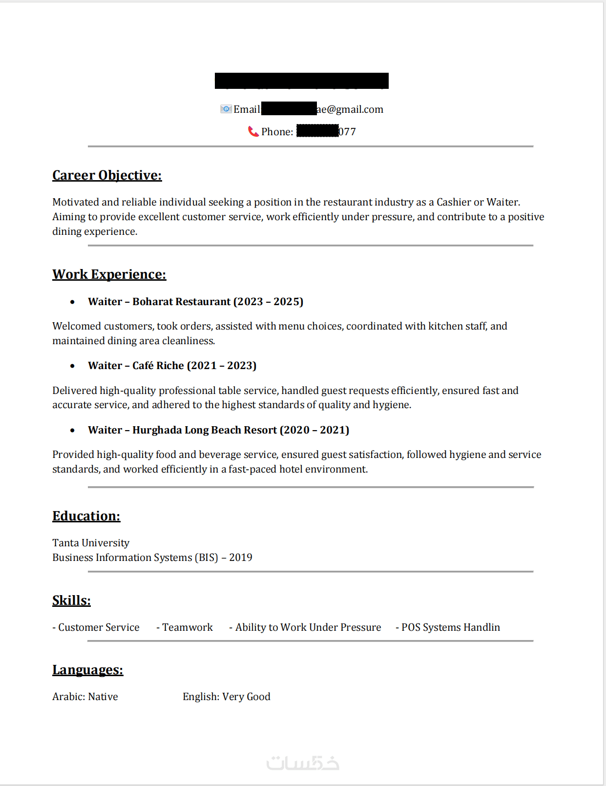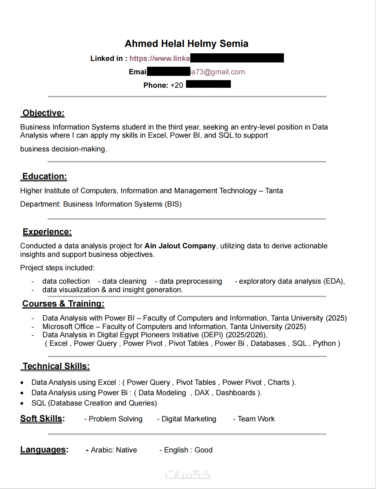 سأقوم بكتابة وترتيب معلوماتك داخل سيرة ذاتية واضحة وحديثة تناسب متطلبات سوق العمل، مع تنسيق جميل وسهل القراءة.