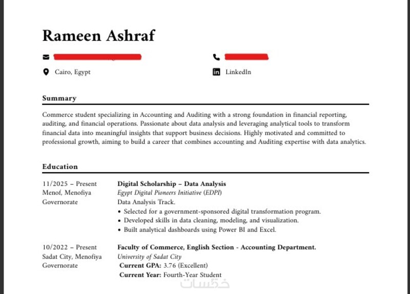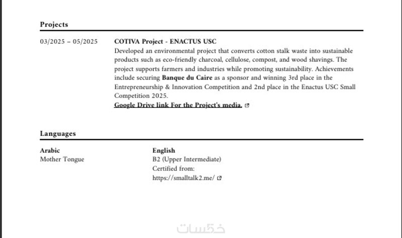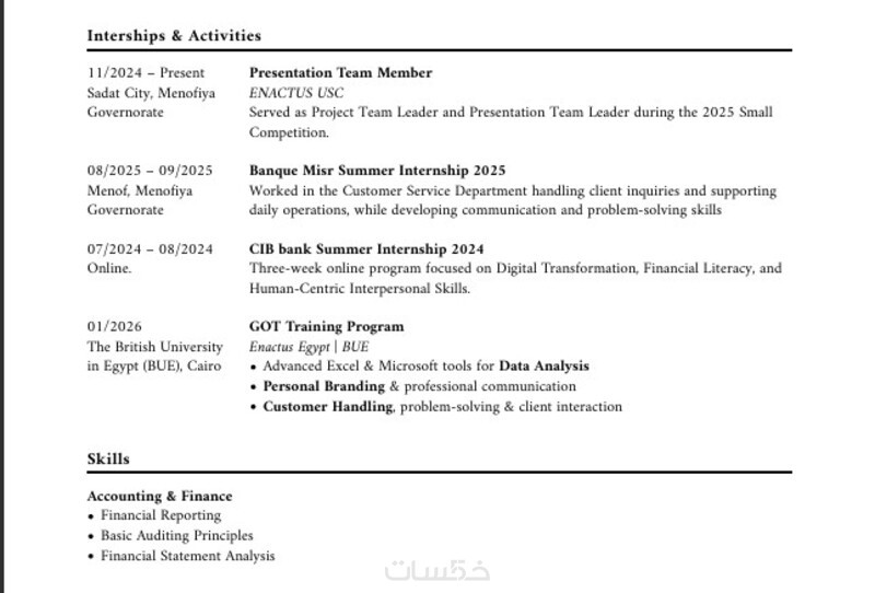 أنا هنا لأكتب لك سيرة ذاتية احترافية ومتوافقة مع ATS بالكلمات المفتاحية الصحيحة والتنسيق المناسب، لتجتاز الفلترة الآلية وتصل مباشرة لصاحب العمل وتترك انطباعاً قوياً.