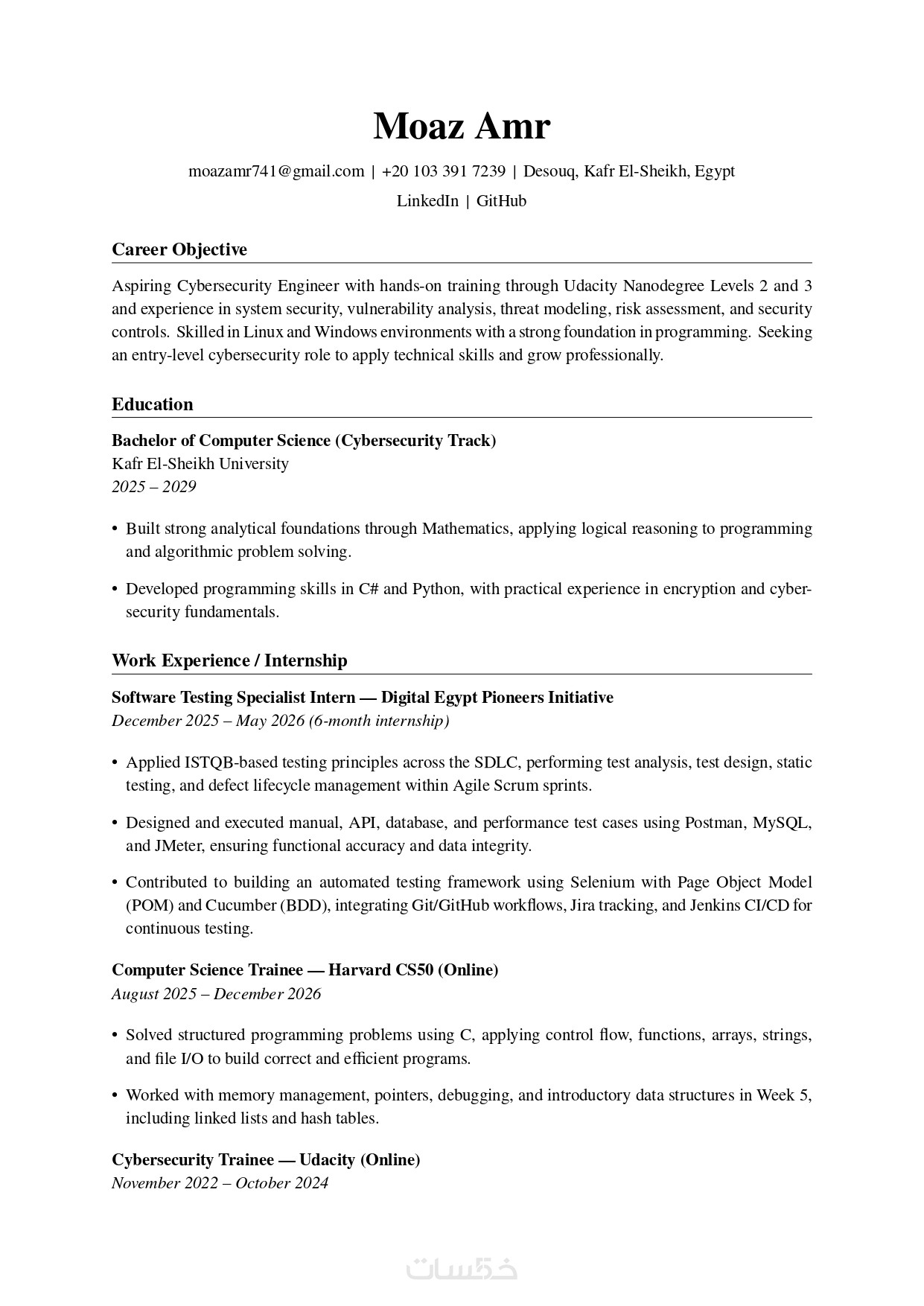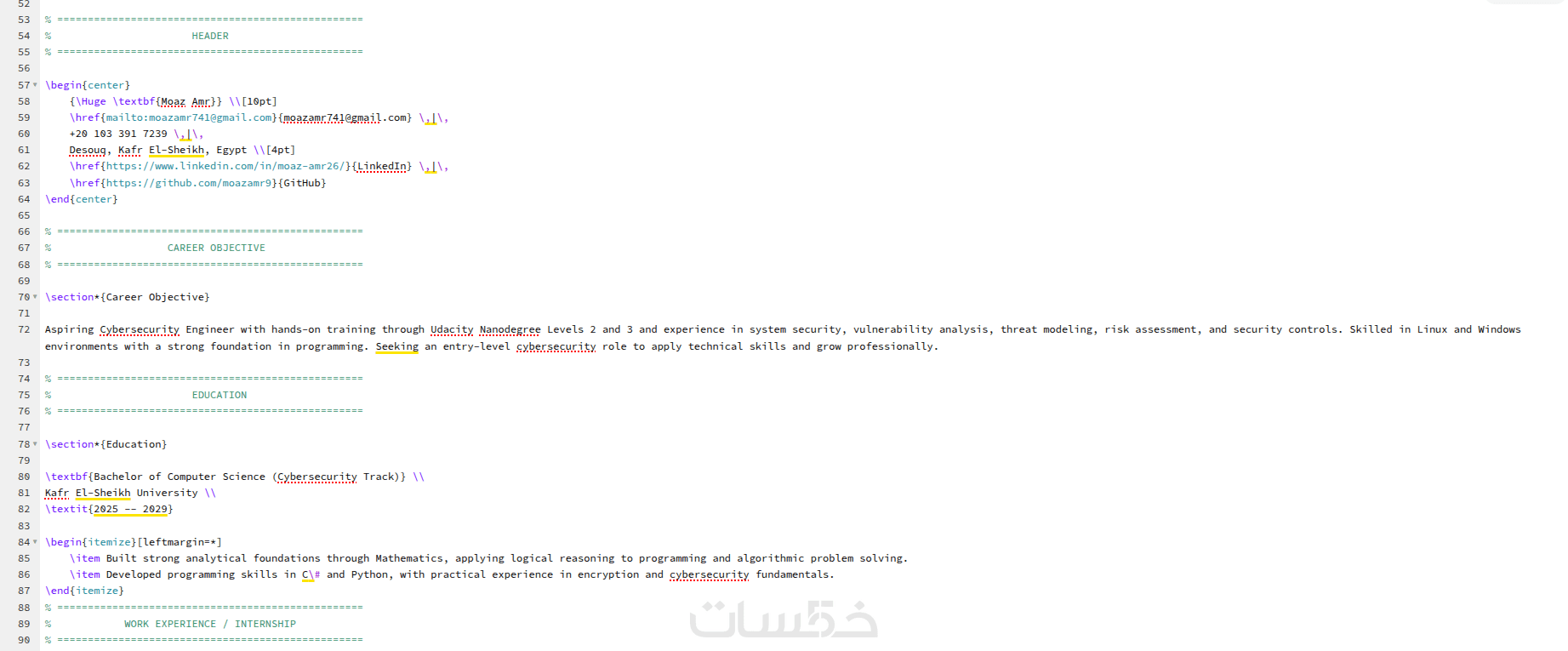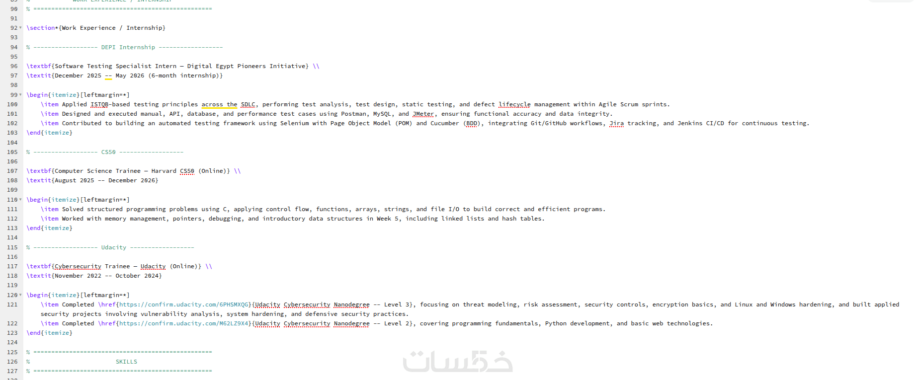 يتم إعداد السيرة الذاتية باستخدام أكواد LaTeX، مما يضمن تنسيقًا عالي الجودة، مظهرًا احترافيًا ثابتًا، وهيكلًا منظمًا ودقيقًا يعكس مستوى احترافي متقدم أمام جهات التوظيف.
