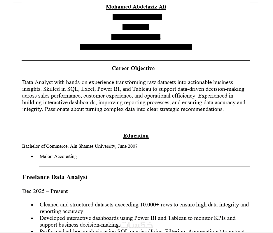 أنا أساعدك في تحويل سيرتك الذاتية إلى ملف احترافي قوي ومقنع يعكس خبراتك بشكل منظم، ويزيد فرصك في القبول والمقابلات بنسبة أكبر.