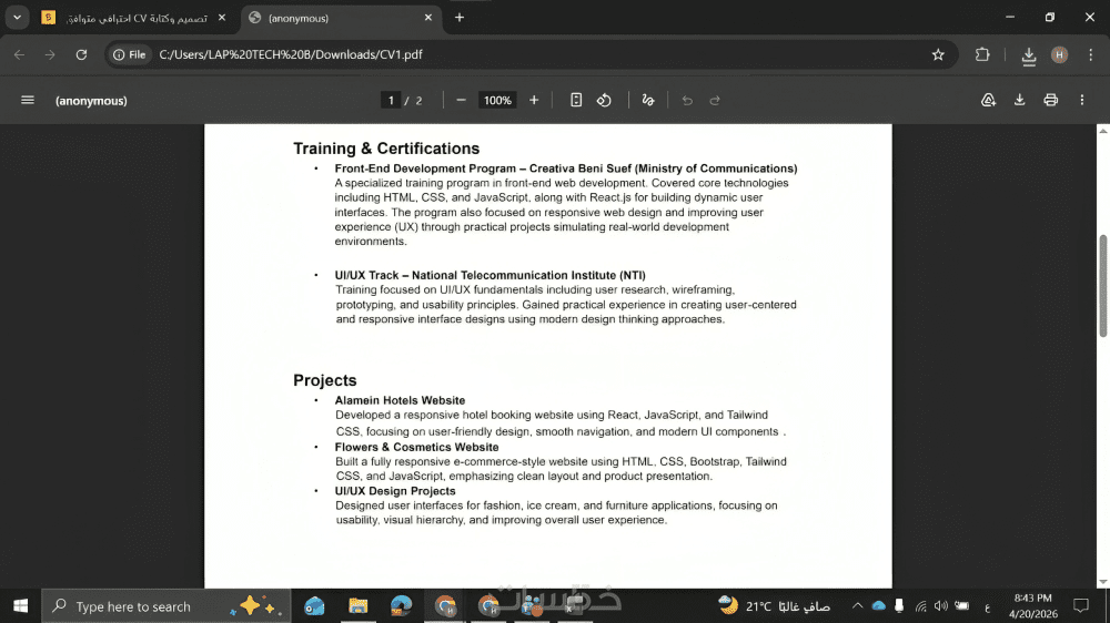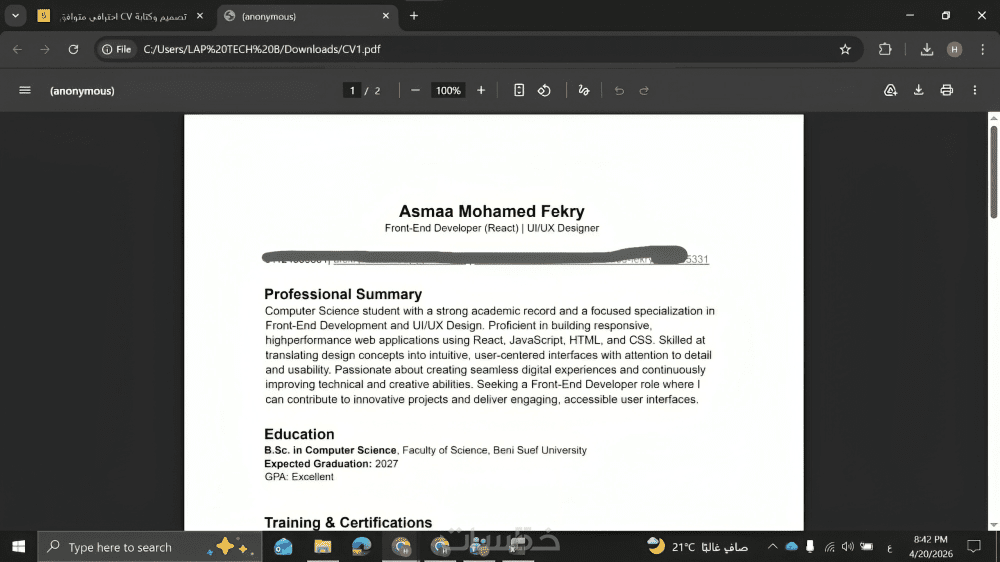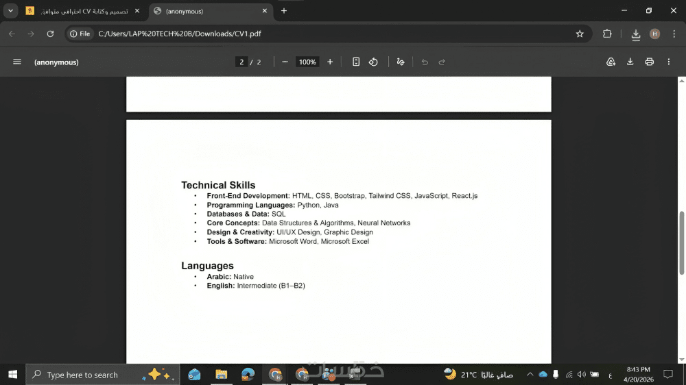 أقوم بتحويل معلوماتك إلى سيرة ذاتية قوية تُظهر نقاط قوتك وتلفت انتباه مسؤولي التوظيف من أول نظرة، سواء كنت طالب أو حديث تخرج أو صاحب خبرة.