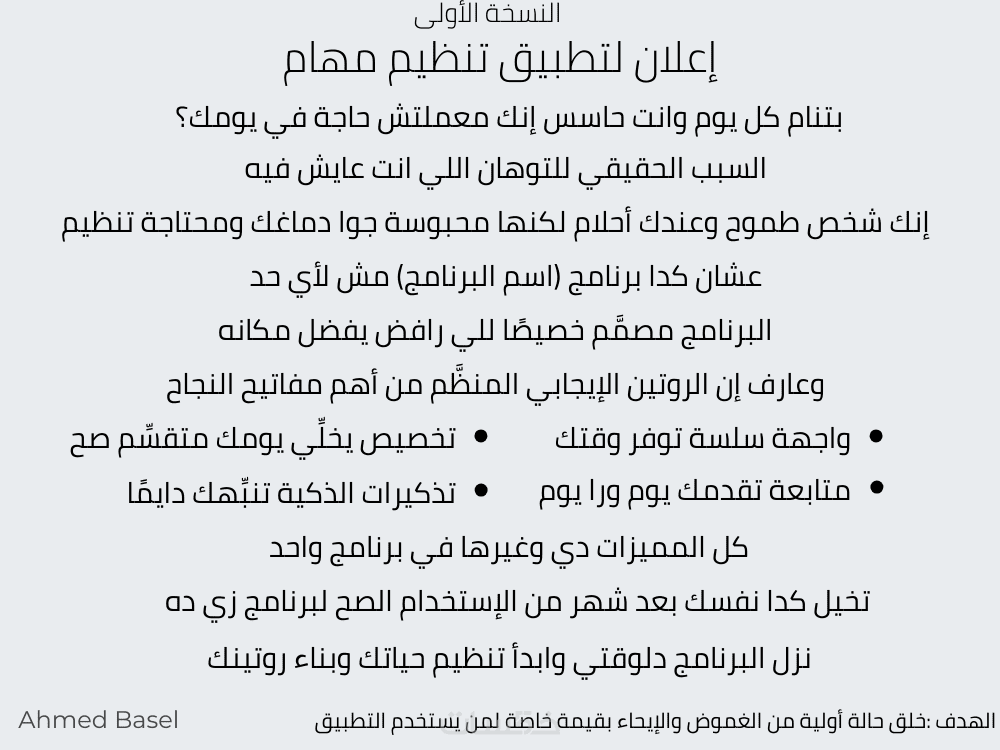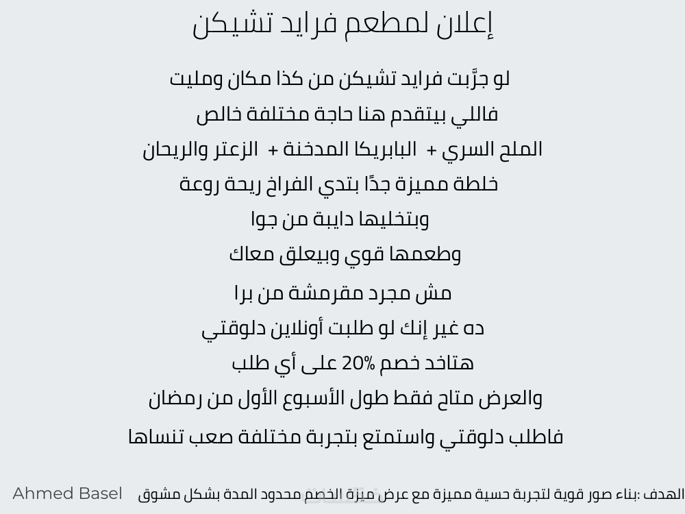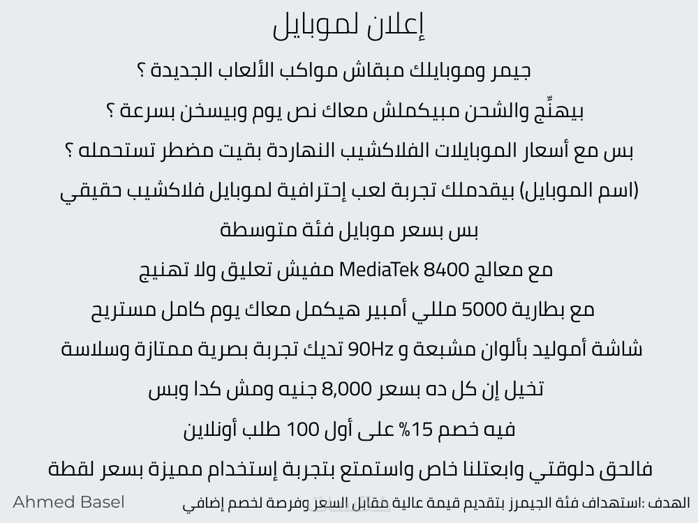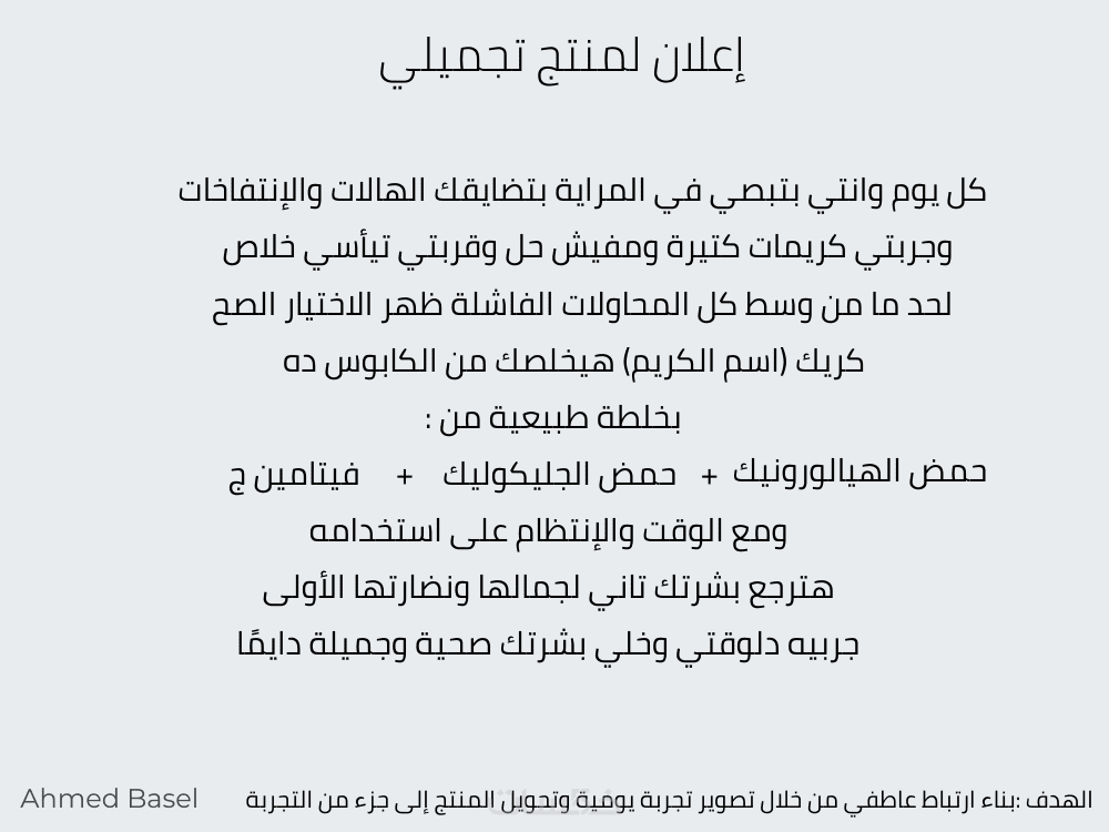 بدلًا من الصياغة التقريرية الجافة، أقدّم إعلانًا يخاطب عقل العميل ومشاعره واحتياجاته الحقيقية لا مجرد كلمات موجهة للخوارزميات.
