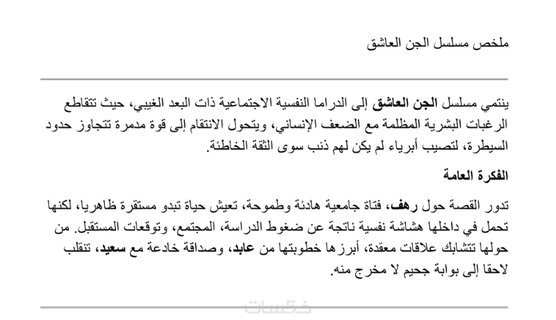 إعداد ملخص احترافي ومعالجة درامية للمسلسل حتى 1000 كلمة.