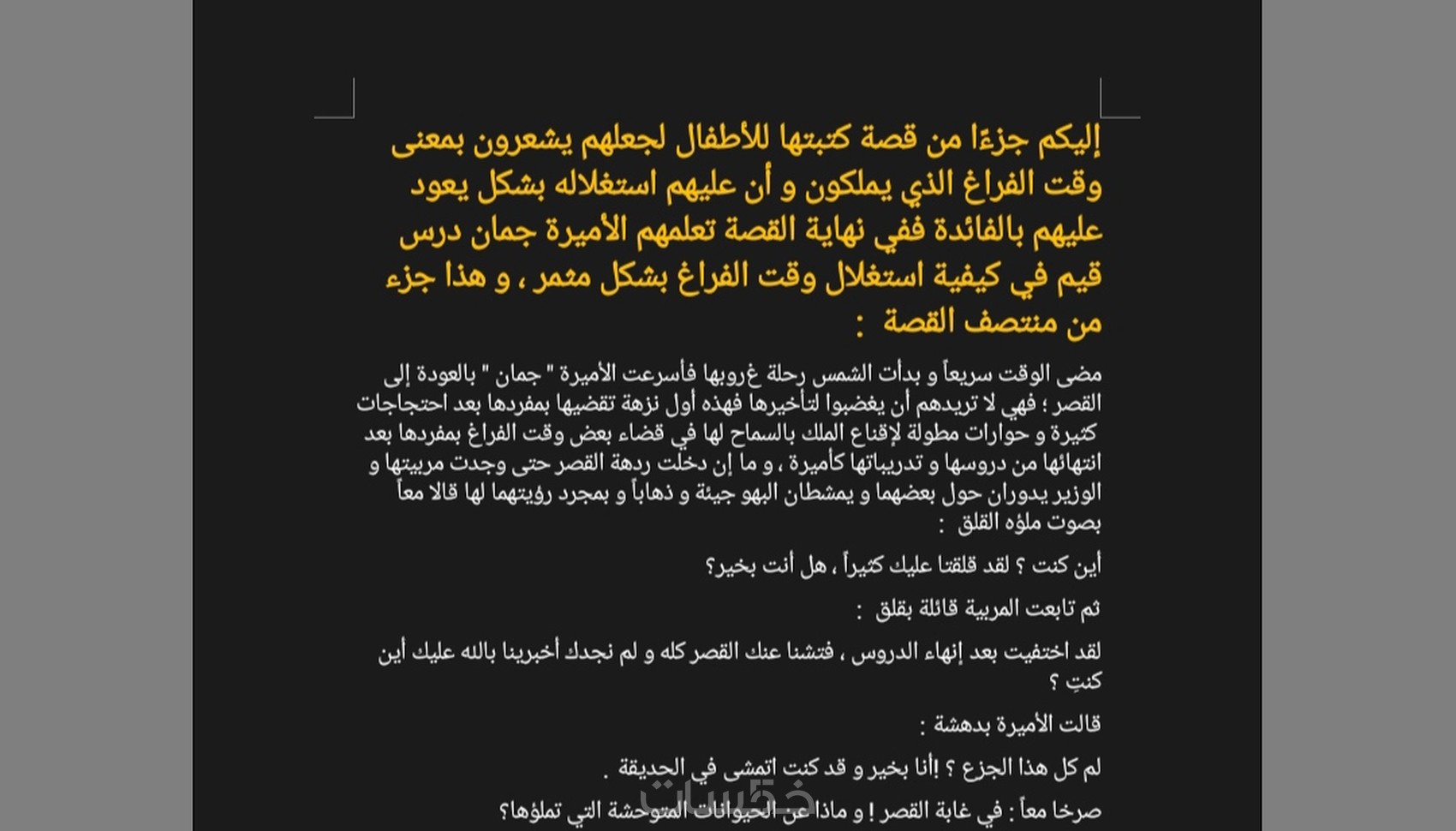 و بما أني أحب أن أسخر قدرتي في الكتابة لكتابة قصص تنقل قيماً نبيلة فباستطاعتي تقديم خدمة كتابة القصص القصيرة لكم حسب الموضوع الذي تريدونه و خلق شخوص تناسب الموضوع المختار.