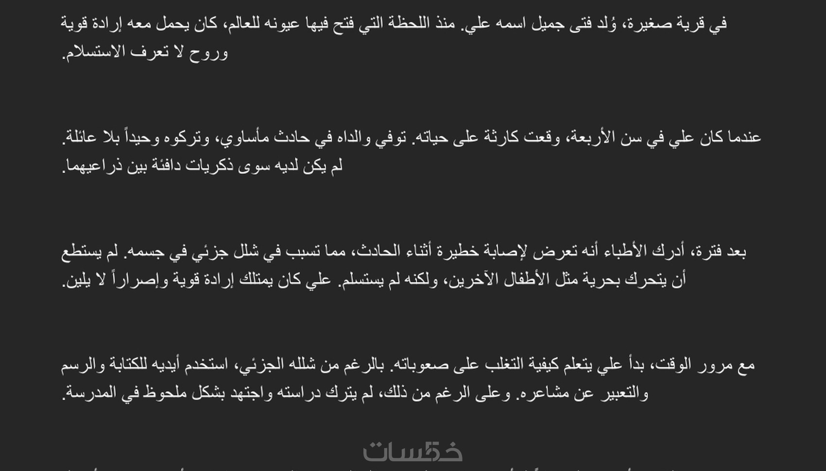 مثال : ببلدة الحلويات الساحرة، عاشت مجموعة من الأطفال النشيطين والمبتهجين. كان هناك صبي صغير اسمه يوسف، كان يعشق الحلويات بكل أنواعها وألوانها. لا يمر يوم دون أن يتناول حلاوة أو كعكة لذيذة.