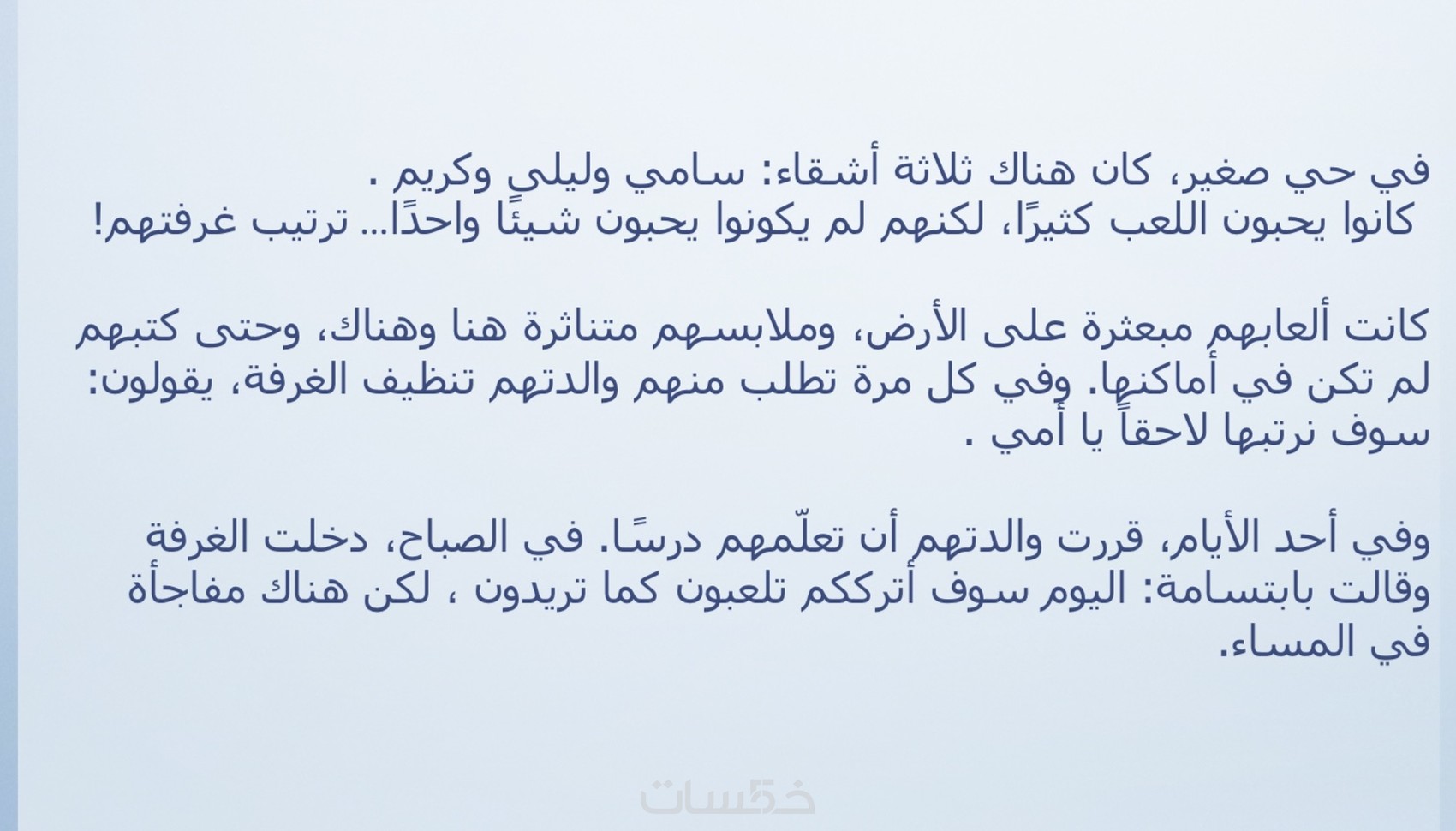 السلام عليكم انا احب كتابة القصص الجميلة للاطفال وتأليفها سأقدم لكم القصص الجميلة والطريفة لاي عنوان تقترحونه او اي نوع تريدونهانا متحمسة لاكتب لكم ولاطفالكم القصص التي ستعجبكم التعديلات متوفرة في اي وقت انجز الخدمة الواحدة ب300 كلمة
