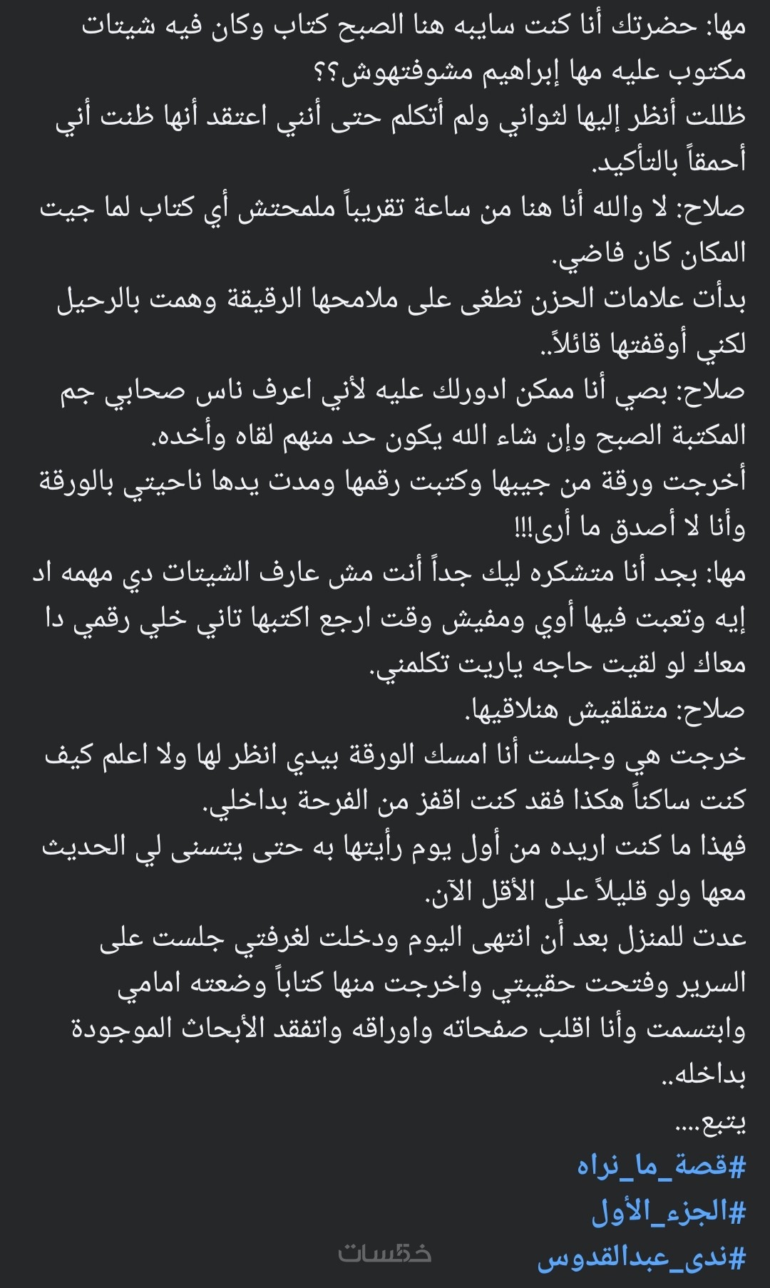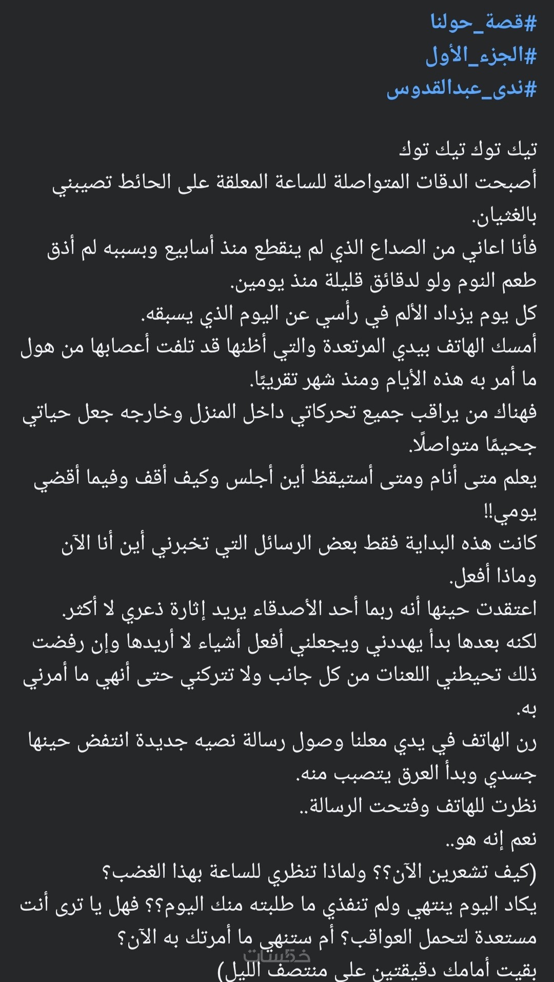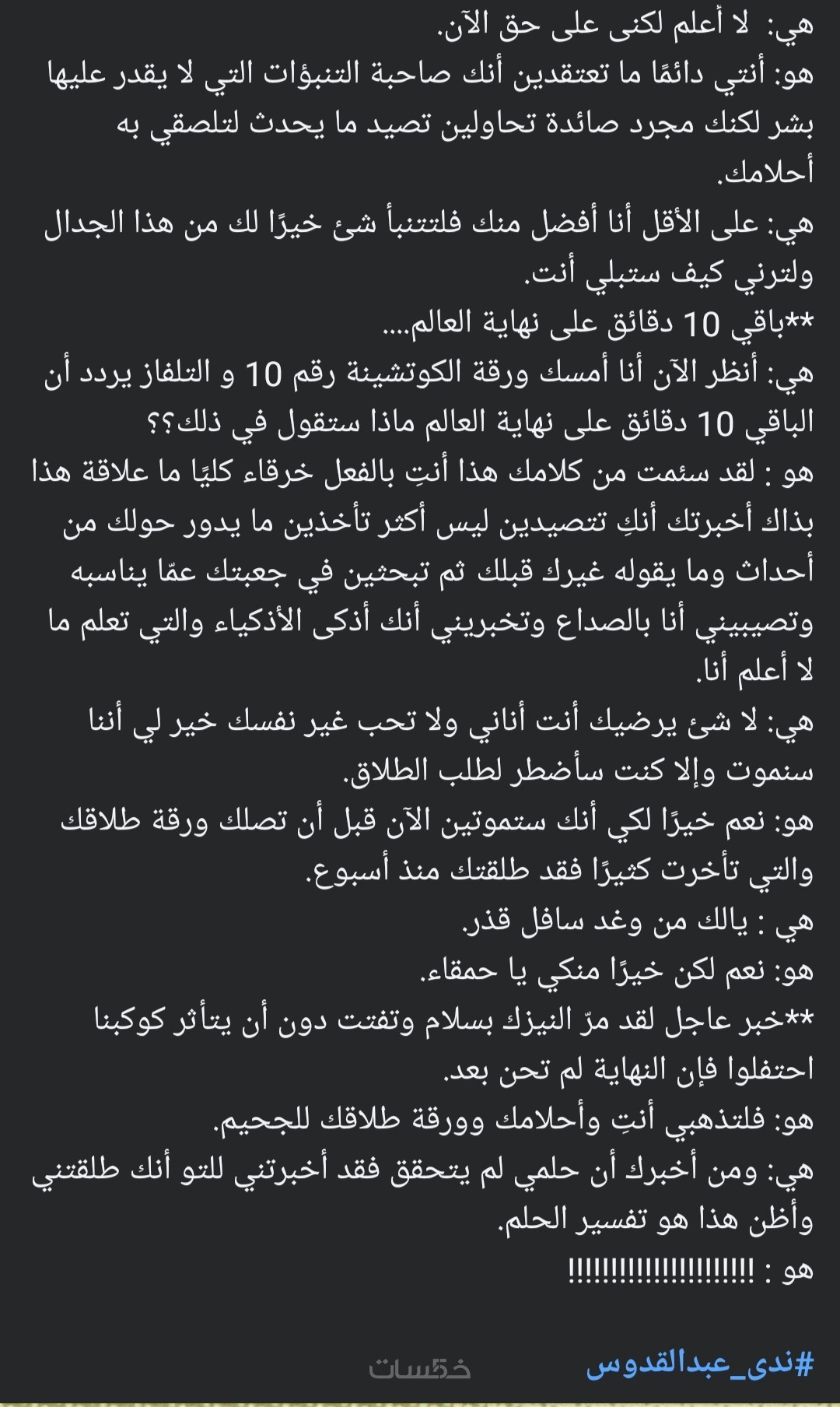 أنا الكاتبة ندى عبدالقدوس، صدرت لي رواية جحيم الأرض عام 2021. لدي أيضًا العديد من القصص القصيرة والكتابات الأدبية التي أنشرها على صفحتي على فيسبوك وتيك توك.