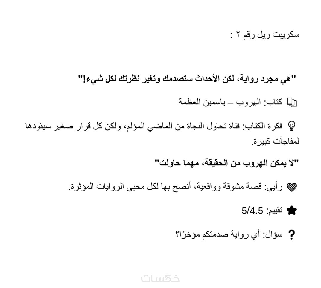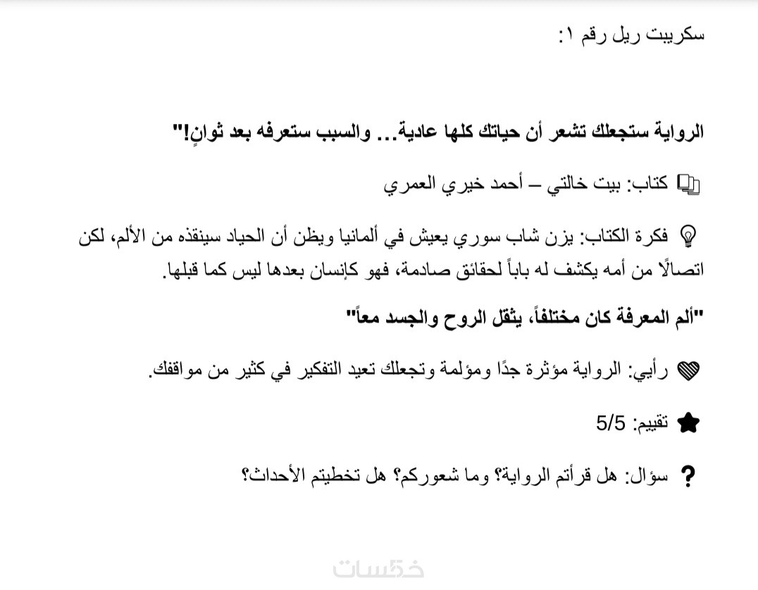 سأكتب لك نص ريل جذاب لمراجعة أي كتاب او أي موضوع متعلق بالقراءة والكتب مع Hook قوي وأفكار تزيد المشاهدات والتفاعل.