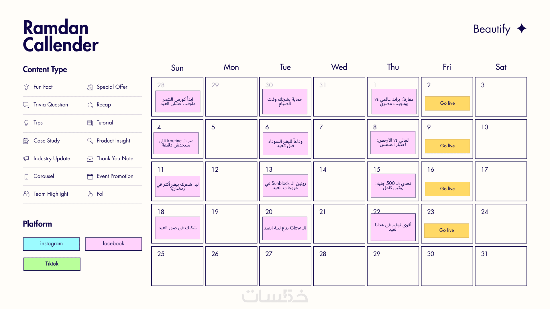 توزيع المنشورات على مدار الشهر/الأسبوع مع تحديد نوع المحتوى (تعليمي، ترويجي، تفاعلي).