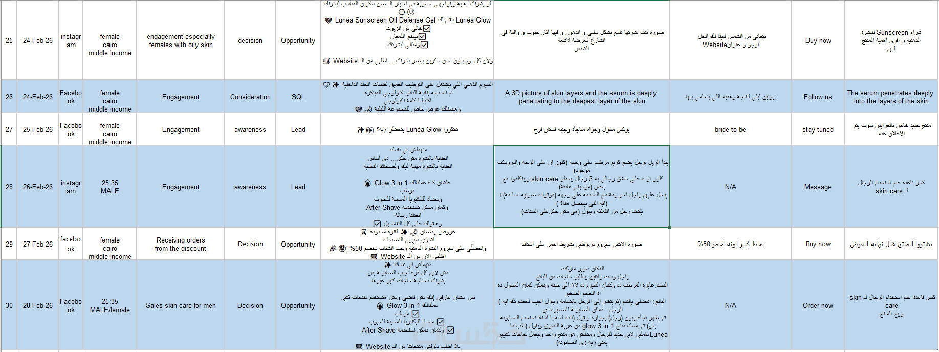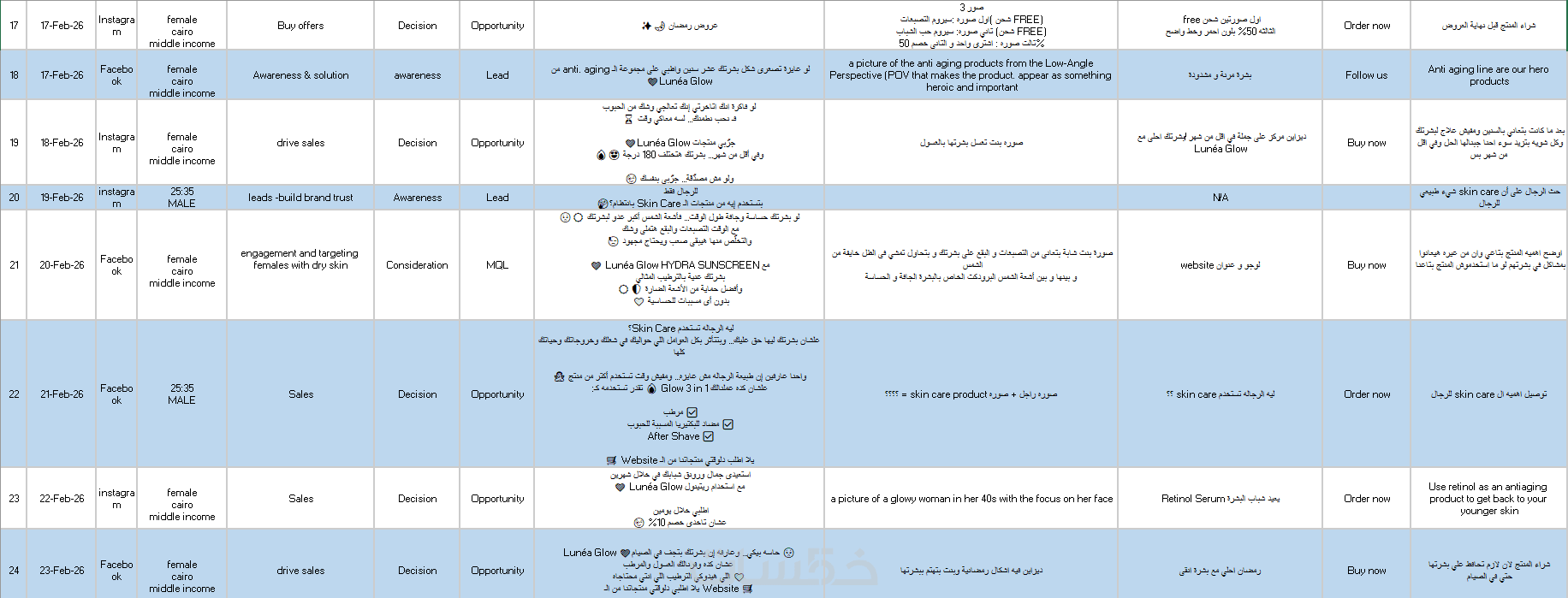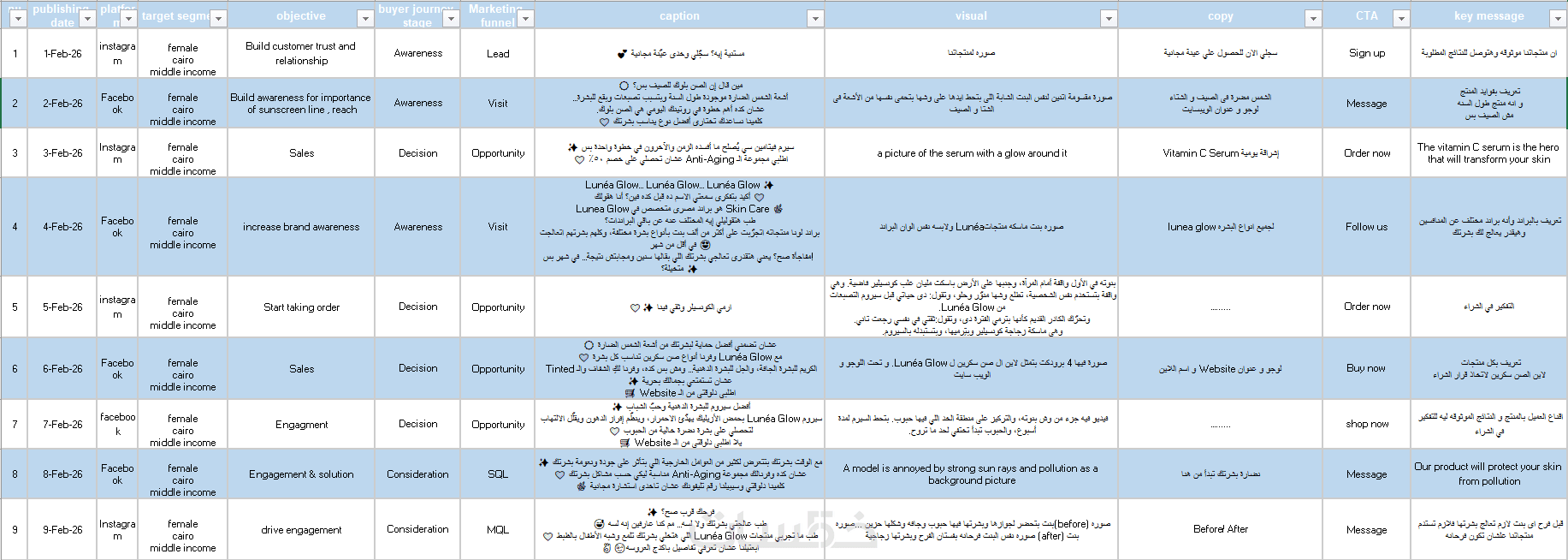 تشمل الخطة كتابة الكابشن، تحديد CTA، اقتراح الأفكار البصرية في جدول واضح (Content Calendar).