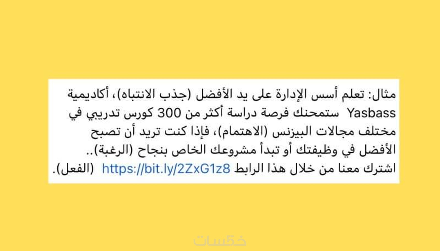 - سأكتب لك نص اعلاني ( بسيط المفردات، عميقة المعاني، مباشرة، صادمة، غير تقليدية )، بحيث تتميز عن غيرك بطرح مميز مكتوب بعناية فائقة، ولغة عربية سليمة، وأسلوب مبتكر يزيد من فرص تفاعل المتابعين مع ما تنشره علي حساباتك الاجتماعية.