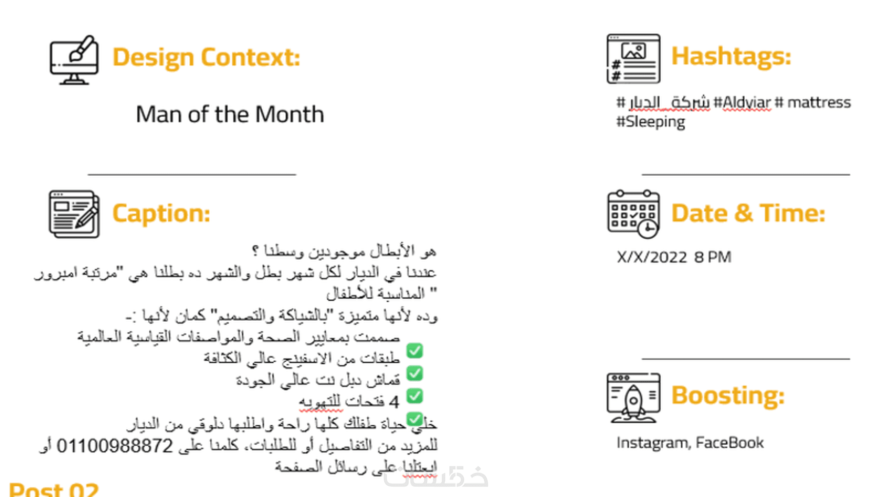 بصفتي Content Creator Manager يمكنني كتابة 2 Posts لوسائل التواصل الاجتماعي الخاصة بالبزنس الخاص بك حيث اطرح عليك 3 أنواع بوستات لكي تختار ما يحتاجه البزنس الخاص بك او يمكنني انا الاختيار لك علي حسب هدفك وما تريد تحقيقه.