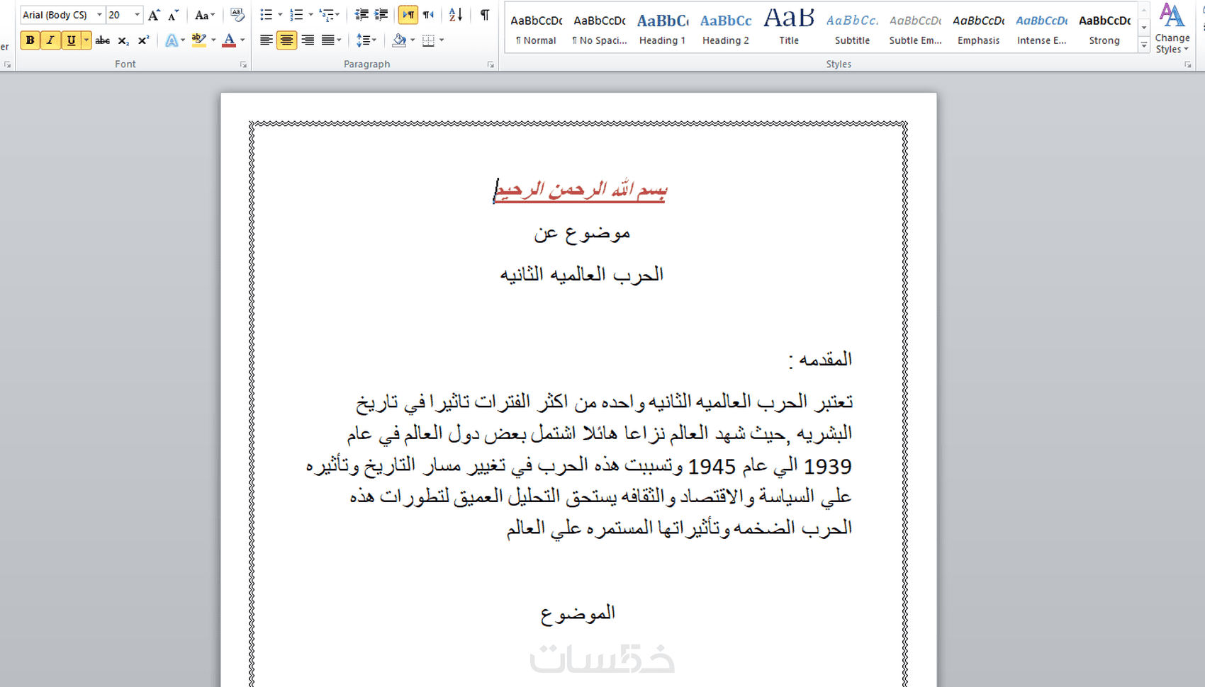 بسم الله الرحمن الرحيم مرحبا عزيزي الزائر !اقدم لكم نفسي ,اسمي عبدالفتاح خالد سوف اقدم لكم في هذه الخدمه كتابه محتوي عبر مايكروسوفت وورد حجم الخط 20 عدد الصفحات 6 حوالي 949 من الكلمات سوف يتم تنسيق الصفحات حسب رغبتك