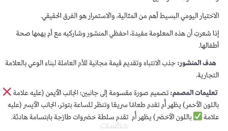 منشور واحد 100 كلمة على الأقل، مع توجيهات للمصمم وكتابة هدف المنشور، يتم تسليمها في ملف Word و ملف PDF لتجنب حدوث أي أخطاء عند تسليم الملف