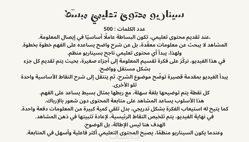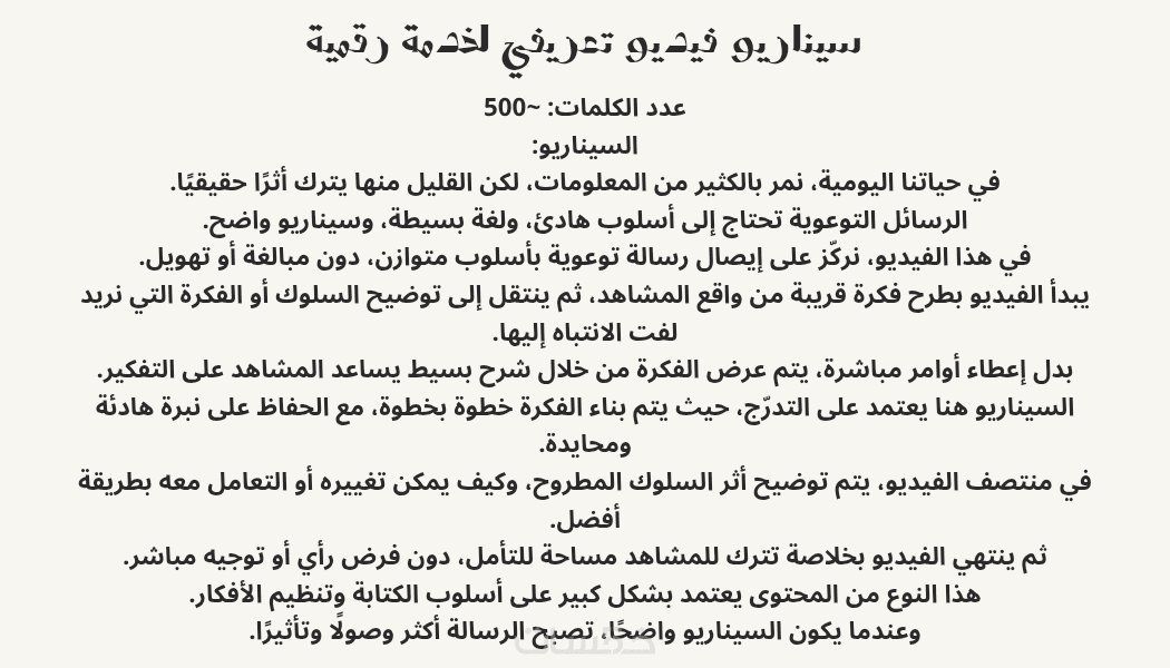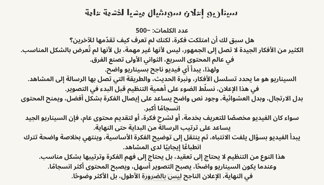 سيناريو مكتوب بعناية لا يتجاوز 500 كلمة، منظم بشكل واضح (بداية – محتوى – نهاية)، يساعد على عرض الفكرة وتسلسلها بطريقة سهلة الفهم والتنفيذ.
